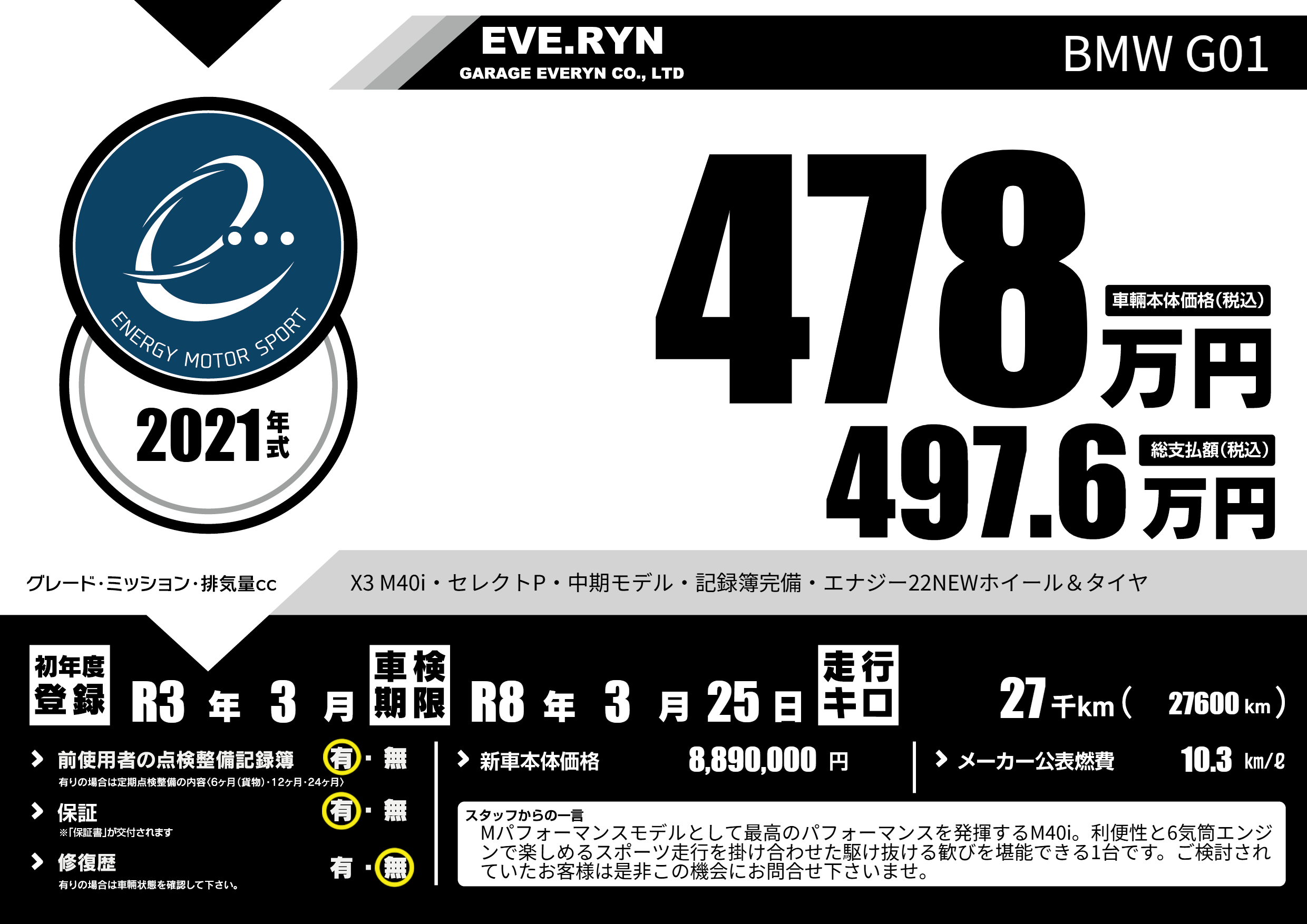 X3 M40i・セレクトP・中期モデル・記録簿完備・エナジー22NEWホイール&タイヤ |