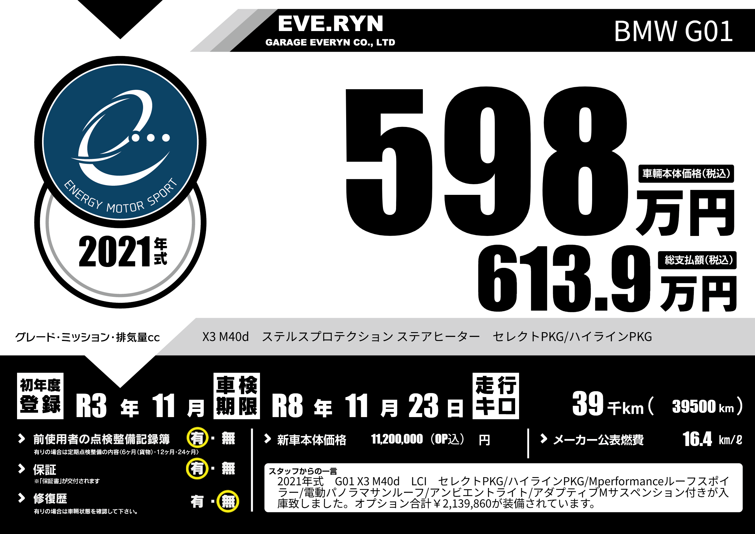 | 車名 | BMW G01 | グレード ミッション 排気量 |