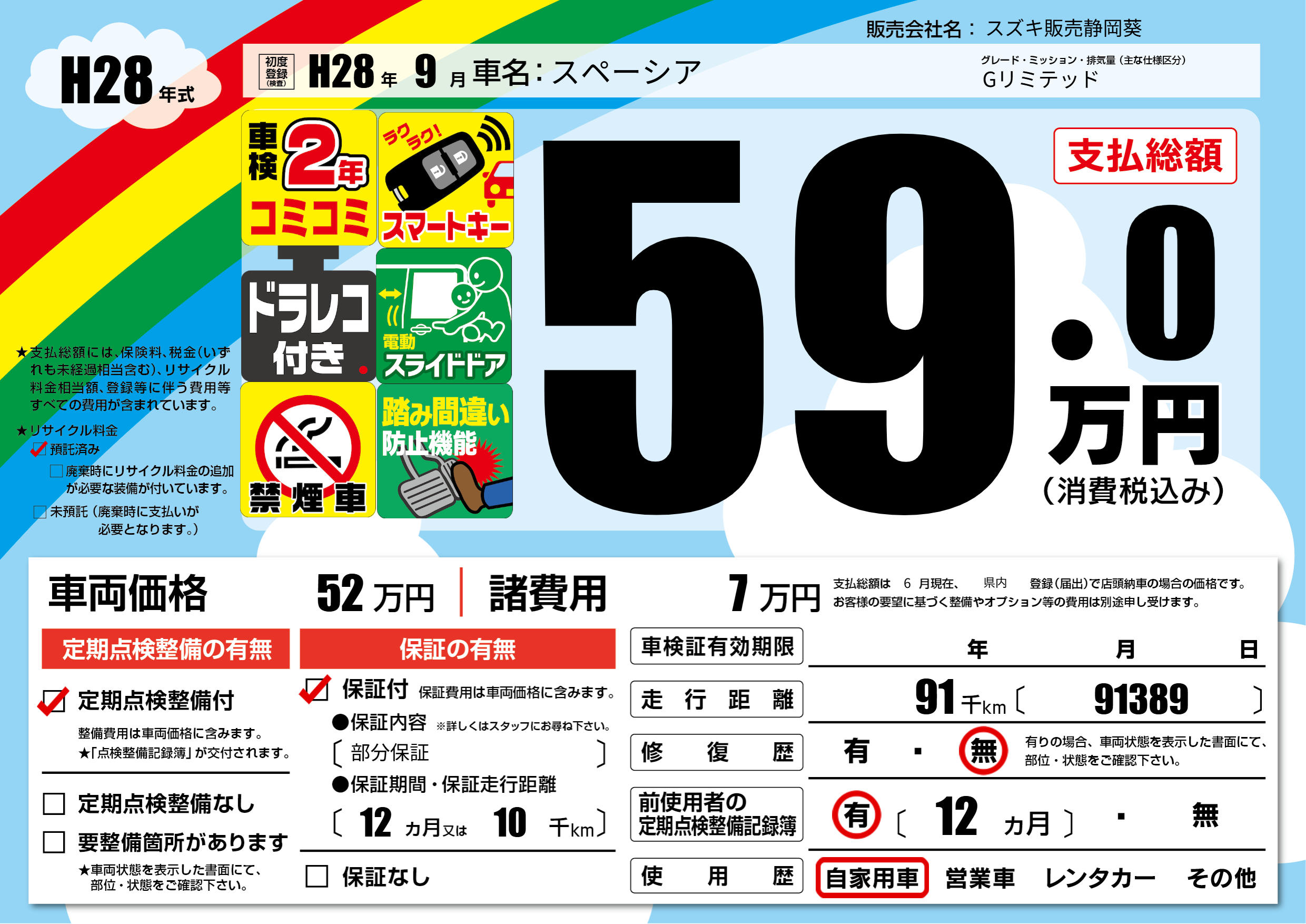 | 走行キロ | 9.1万km | 初年度登録 | H28年9月 |