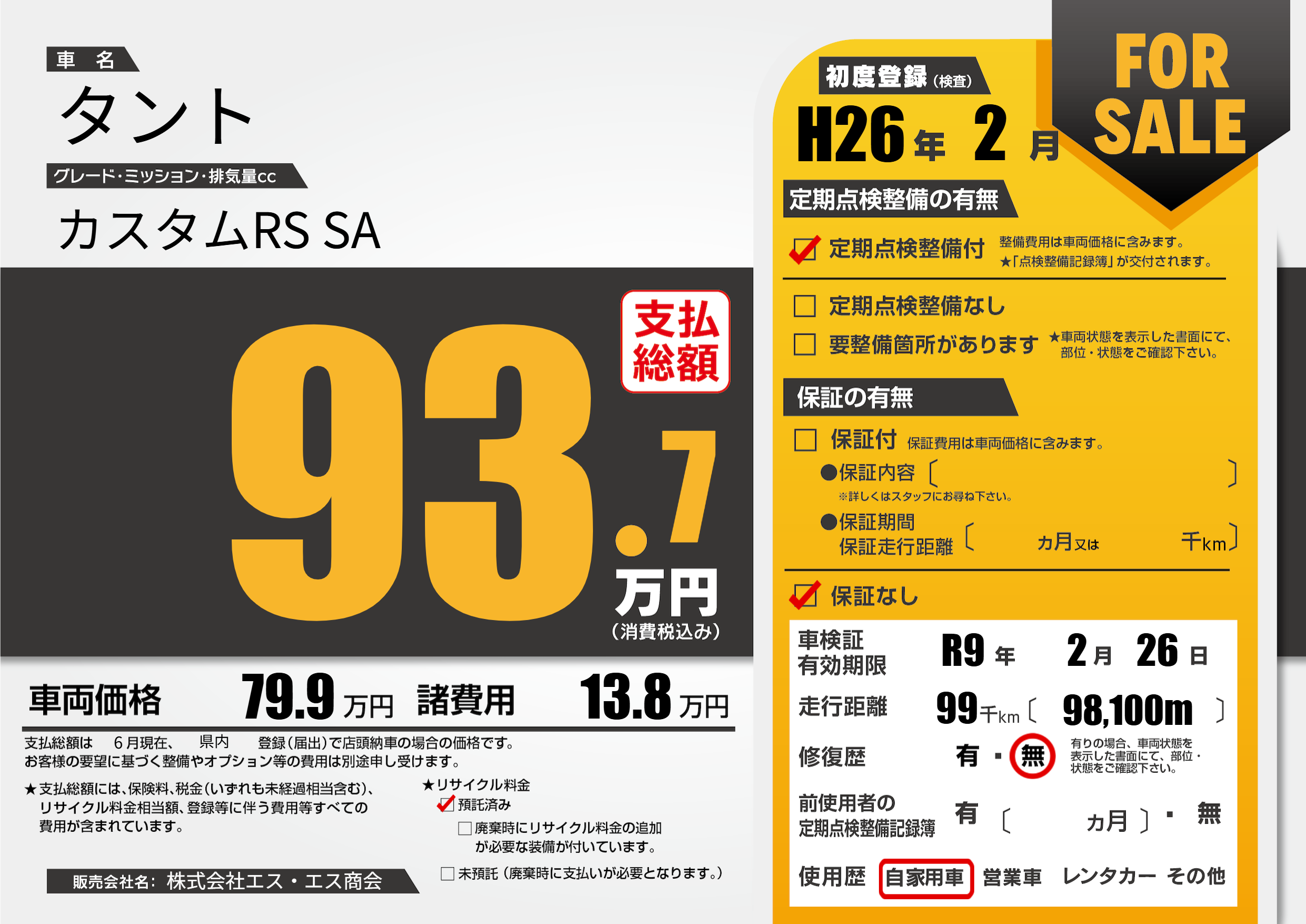 | 走行キロ | 9.9万km | 初年度登録 | H26年2月 |