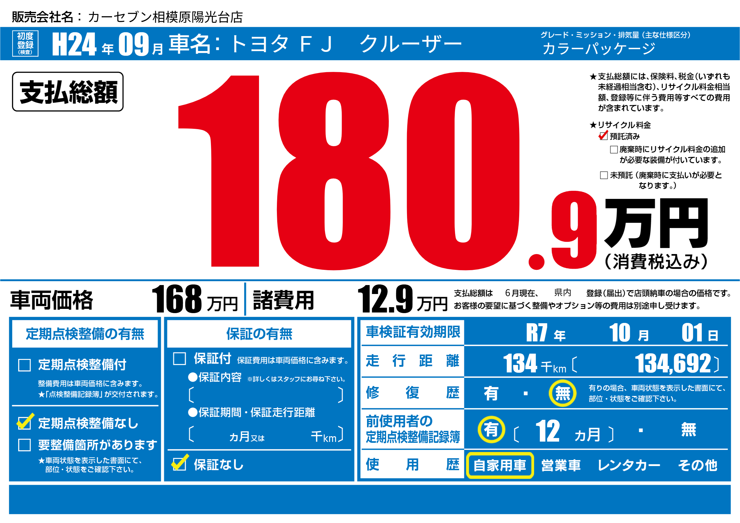 | 走行キロ | 13.4万km | 初年度登録 | H24年09月 |