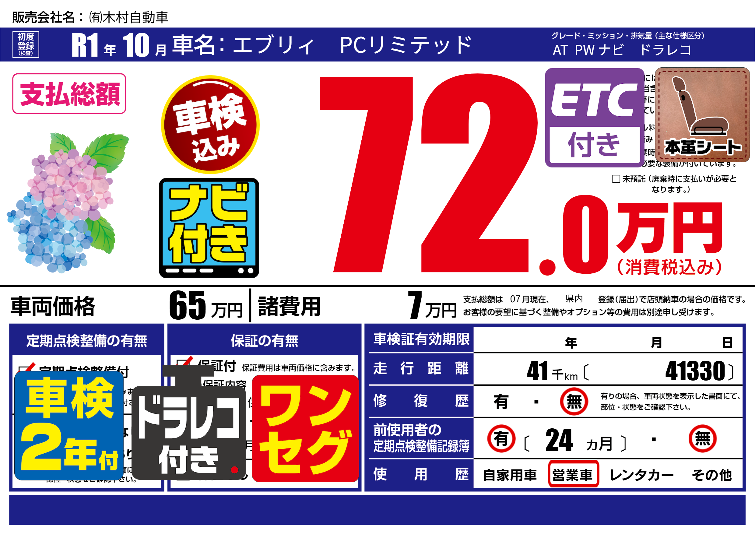 | 車名 | エブリィ PCリミテッド | グレード ミッション 排気量 |