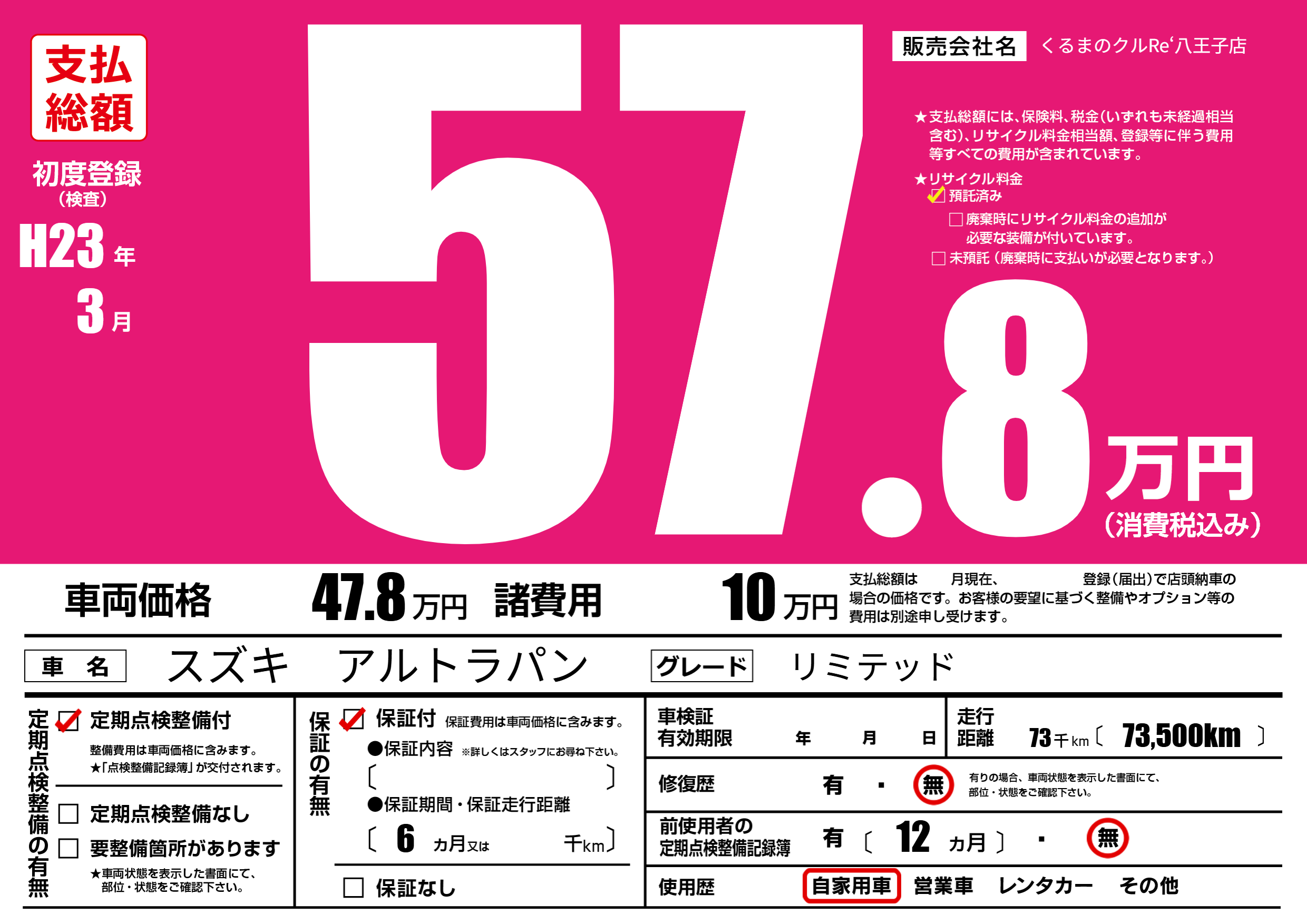 | 走行キロ | 7.3万km | 初年度登録 | H23年3月 |