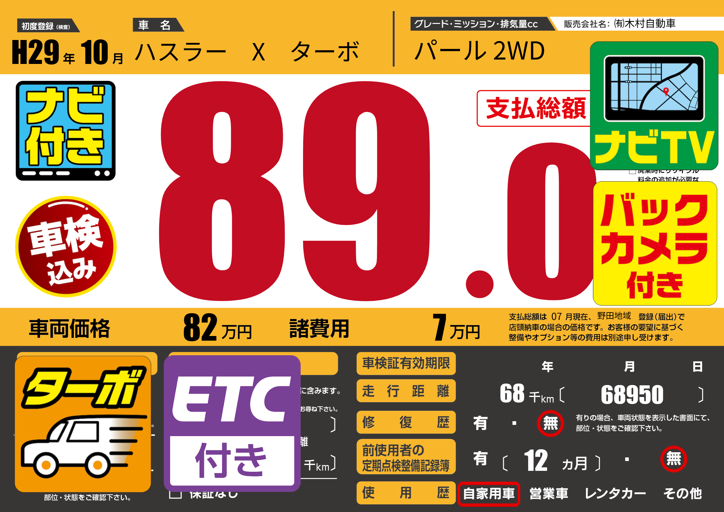 | 車名 | ハスラー X ターボ | グレード ミッション 排気量 |