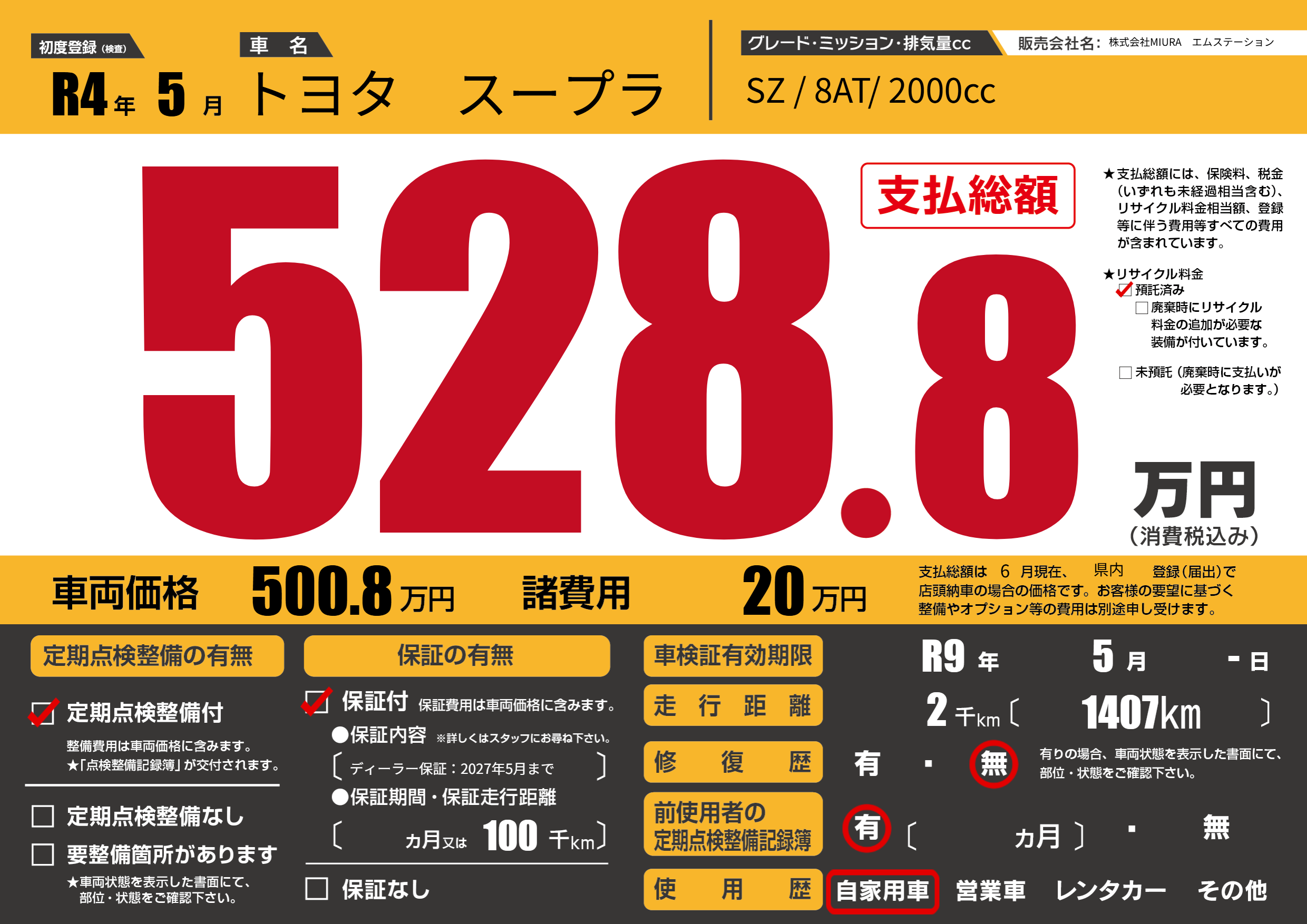 | 車名 | トヨタ スープラ | グレード ミッション 排気量 |