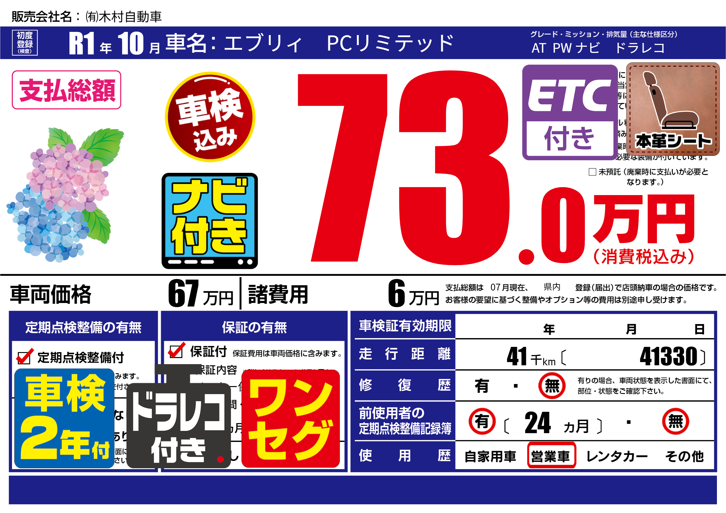 | 車名 | エブリィ PCリミテッド | グレード ミッション 排気量 |