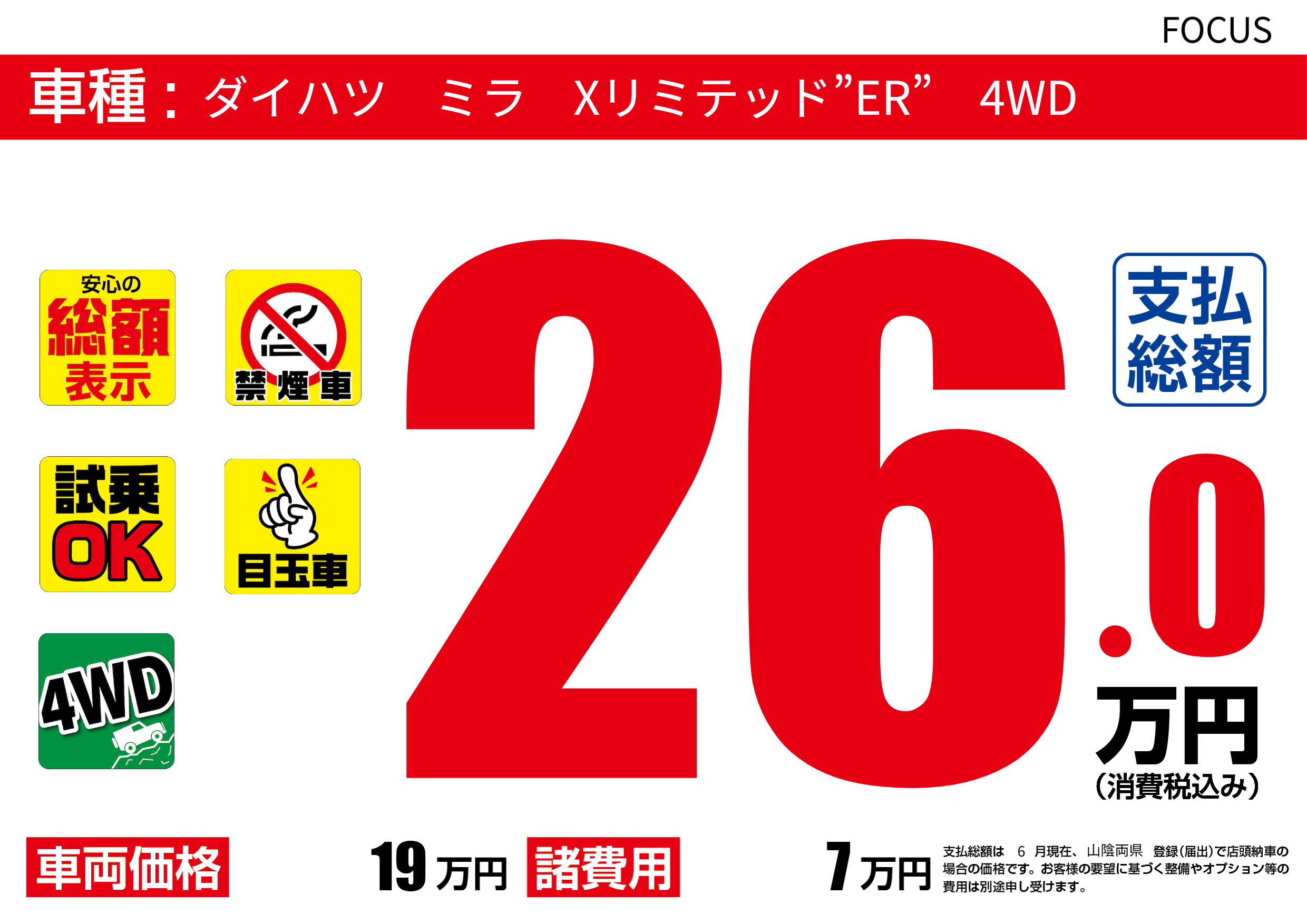 | 車名 | ダイハツ ミラ Xリミテッド”ER” 4WD | グレード ミッション 排気量 |