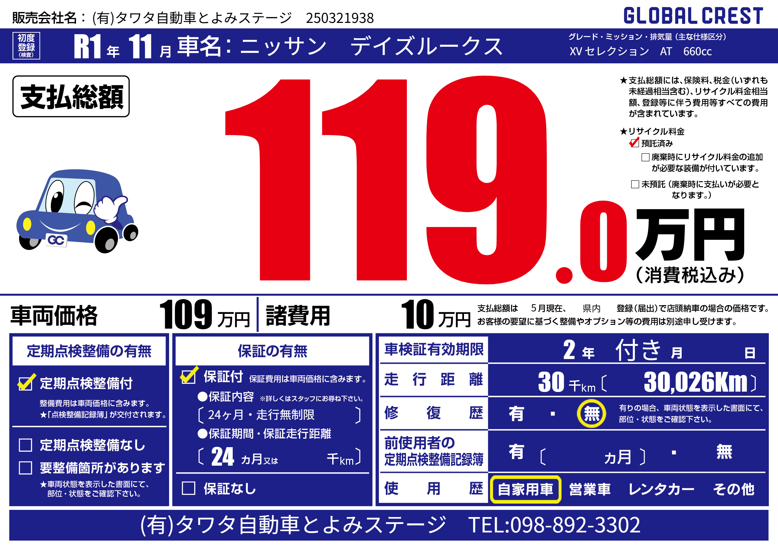 | 走行キロ | 3万km | 初年度登録 | R1年11月 |