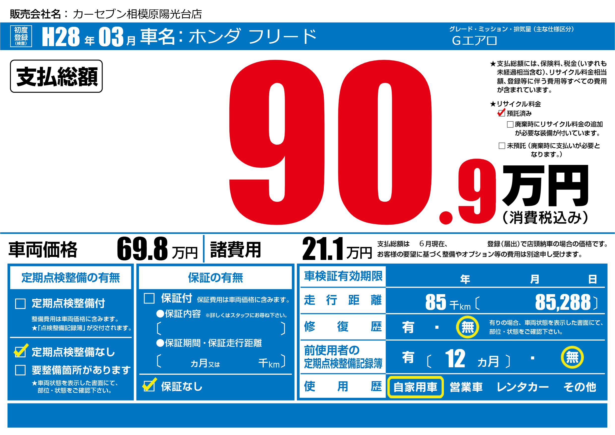 | 車名 | ホンダ フリード | グレード ミッション 排気量 |