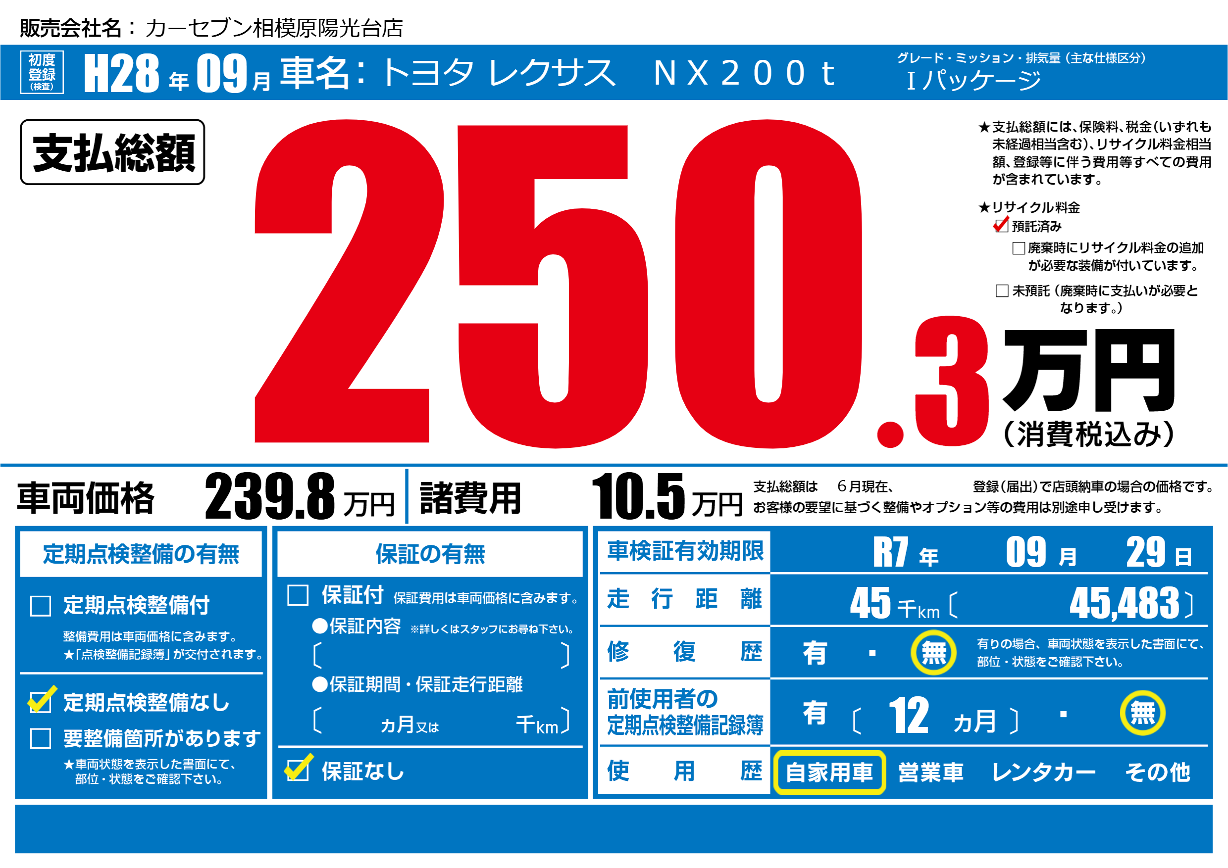 | 車検制限 | R7年 09月 29日 | ||