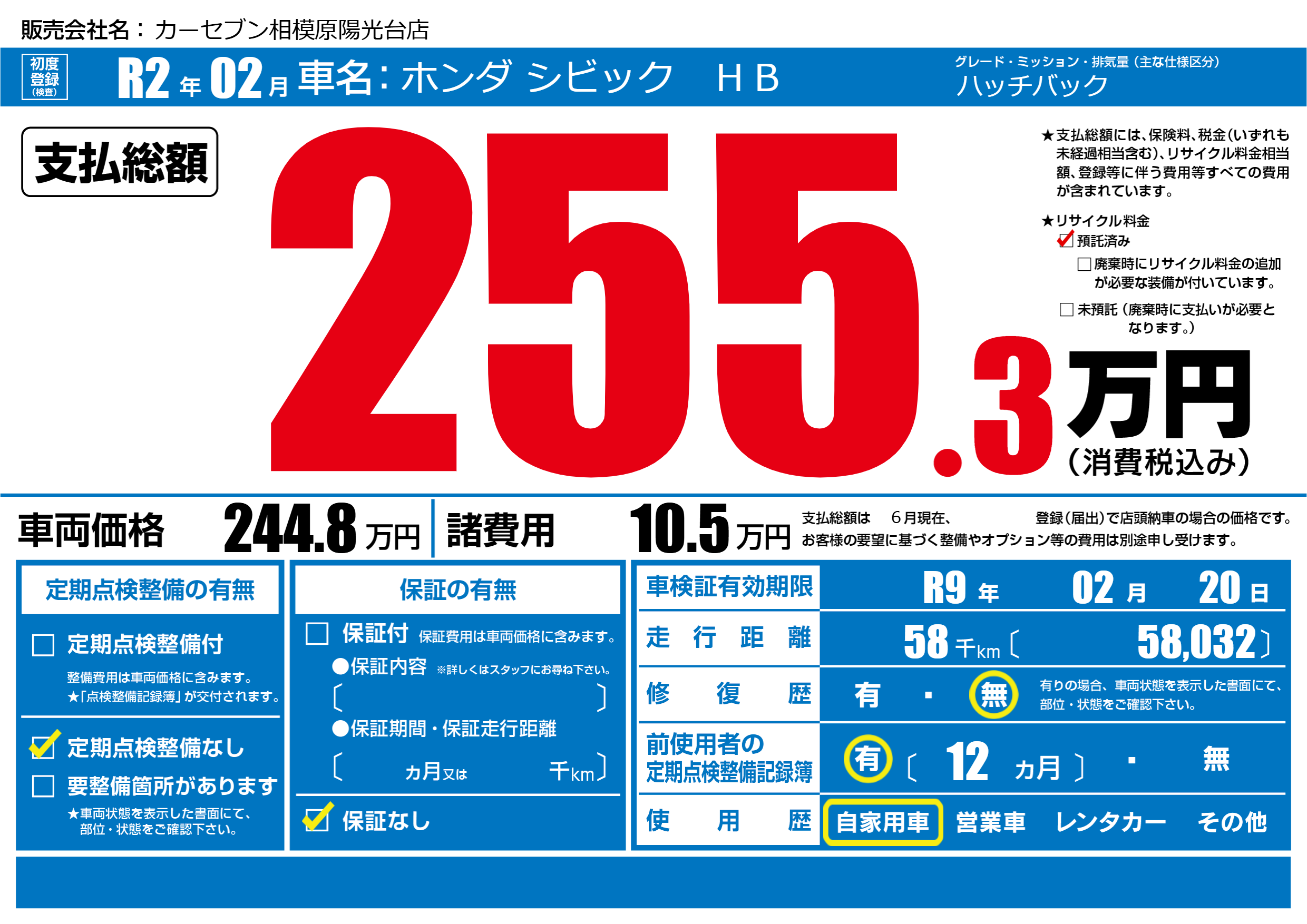 | 車名 | ホンダ シビック HB | グレード ミッション 排気量 |
