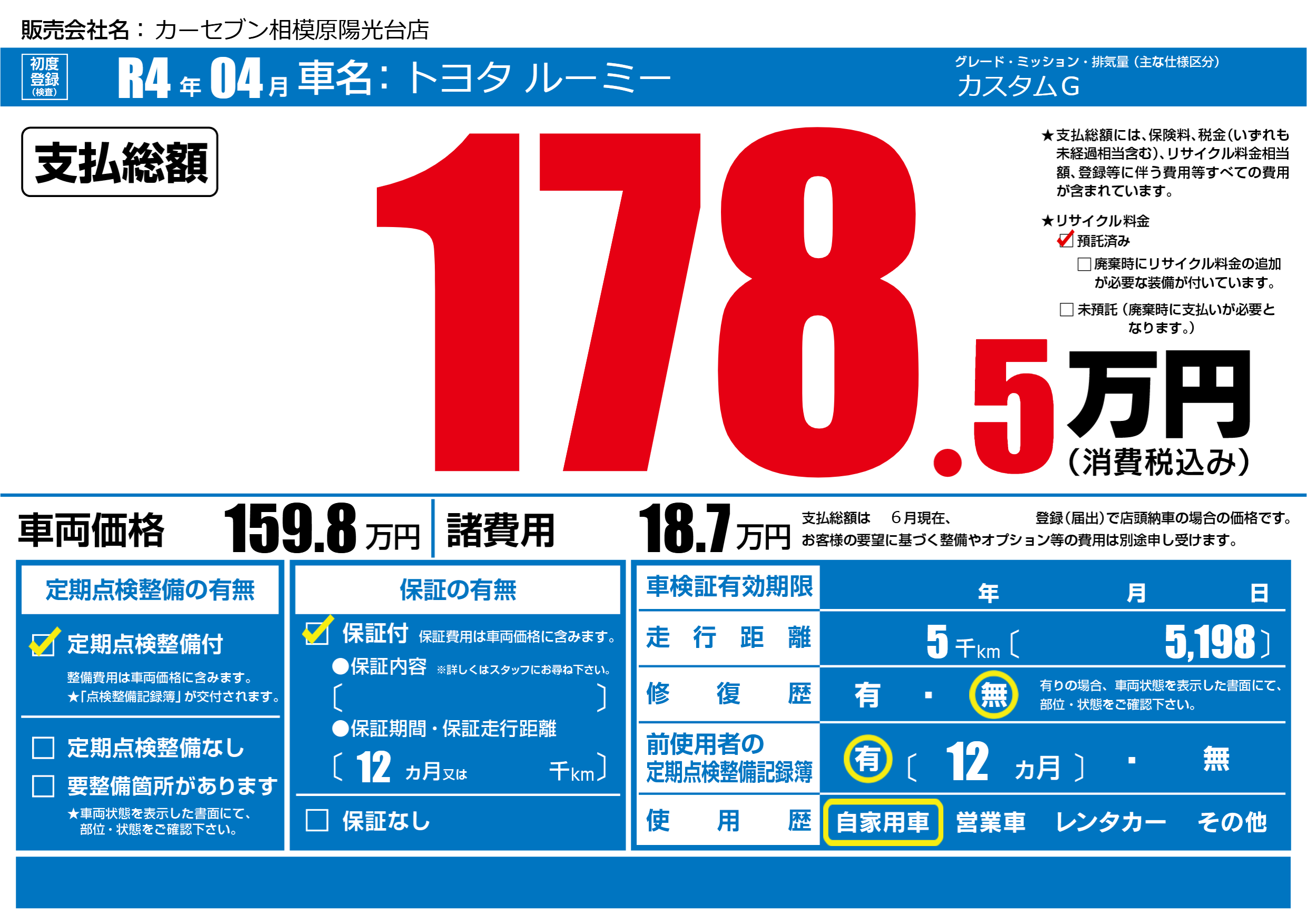 | 車名 | トヨタ ルーミー | グレード ミッション 排気量 |