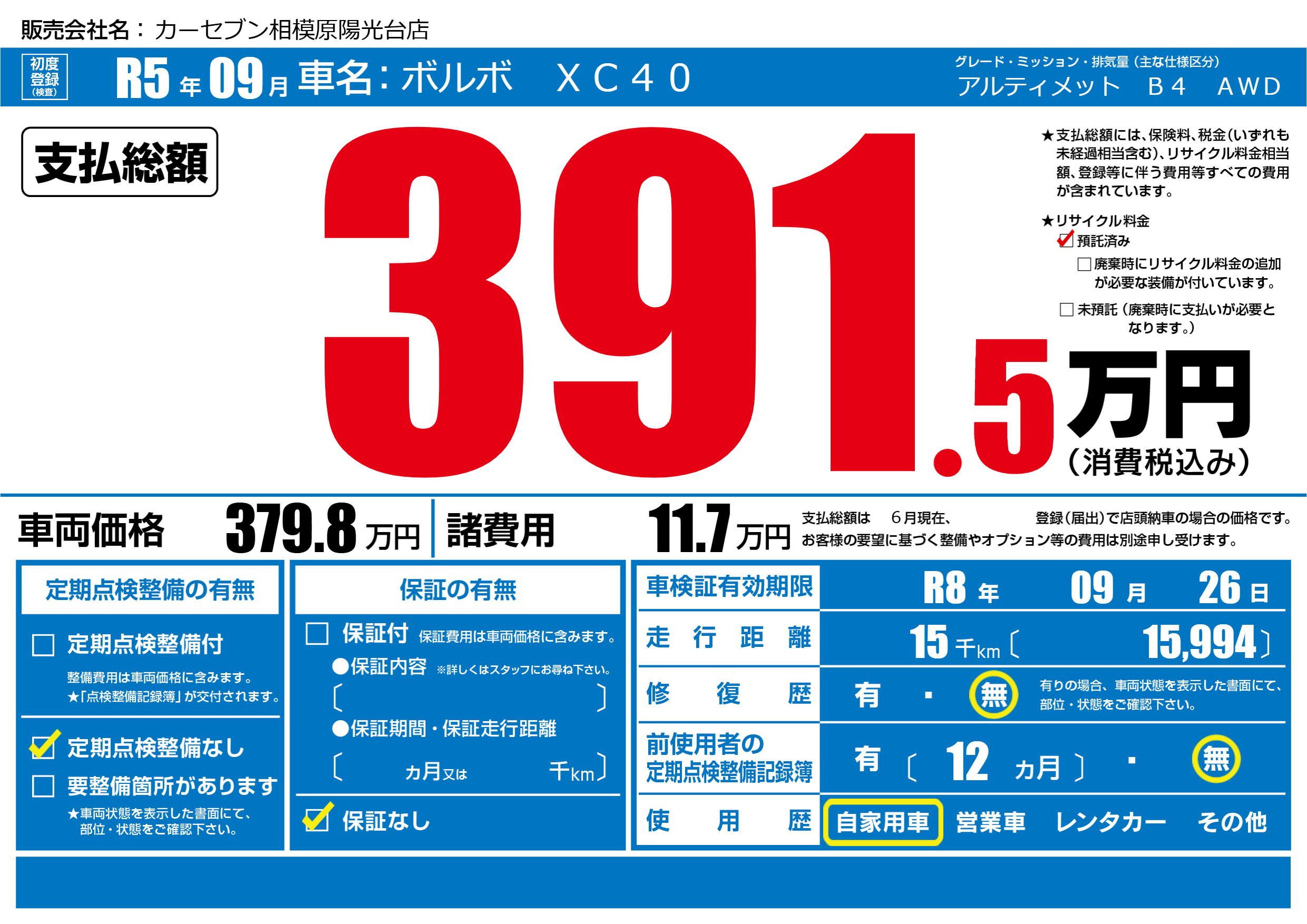 | 車名 | ボルボ XC40 | グレード ミッション 排気量 |