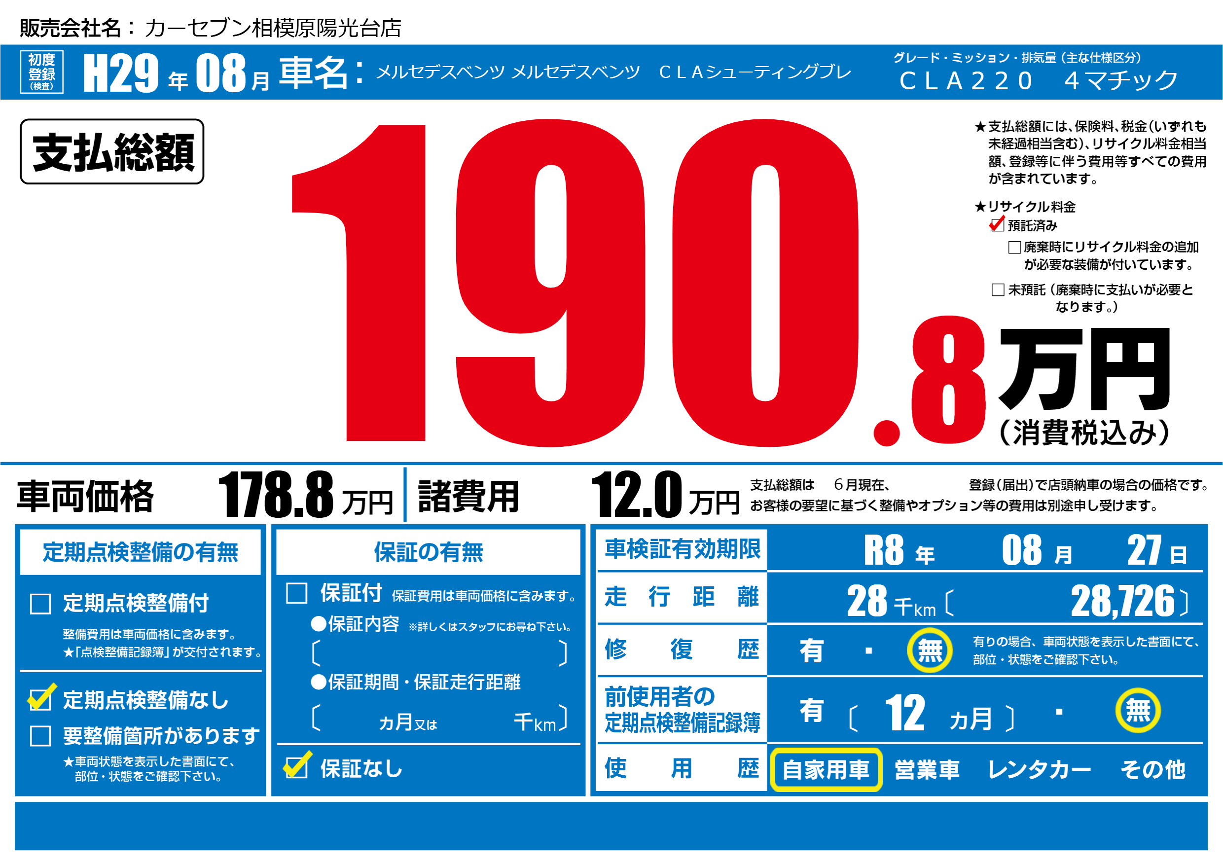| 車検制限 | R8年 08月 27日 | ||