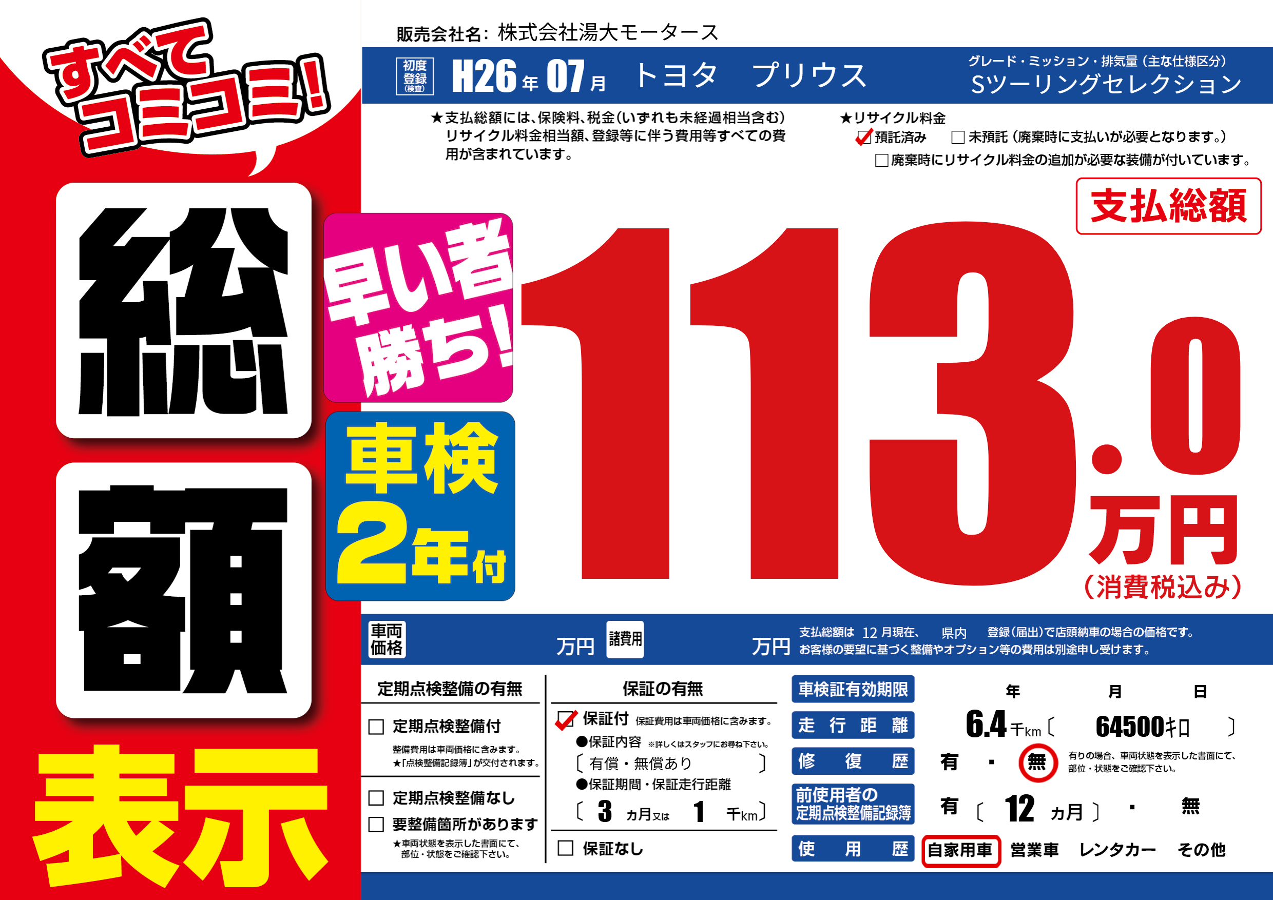 | 車名 | トヨタ プリウス | グレード ミッション 排気量 |