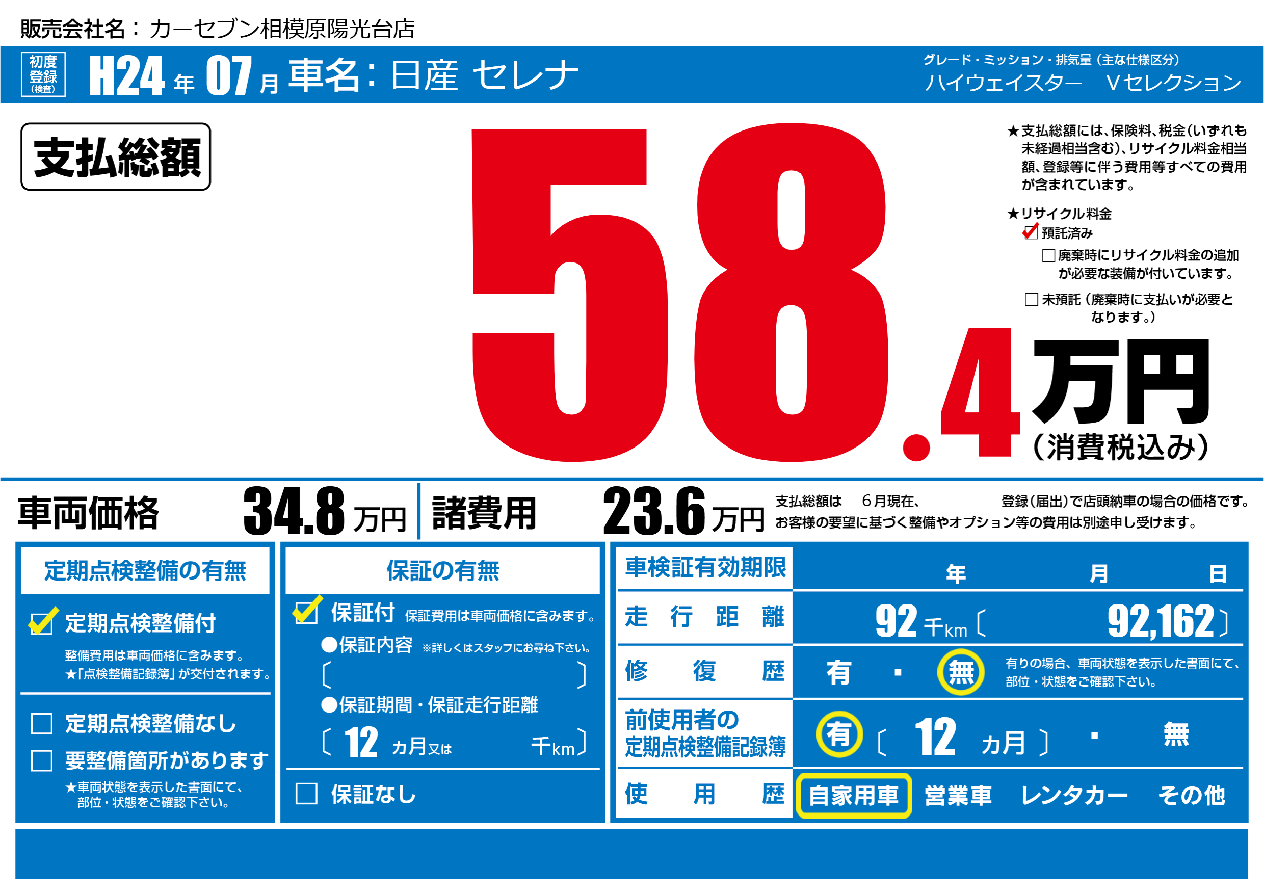 | 走行キロ | 9.2万km | 初年度登録 | H24年07月 |