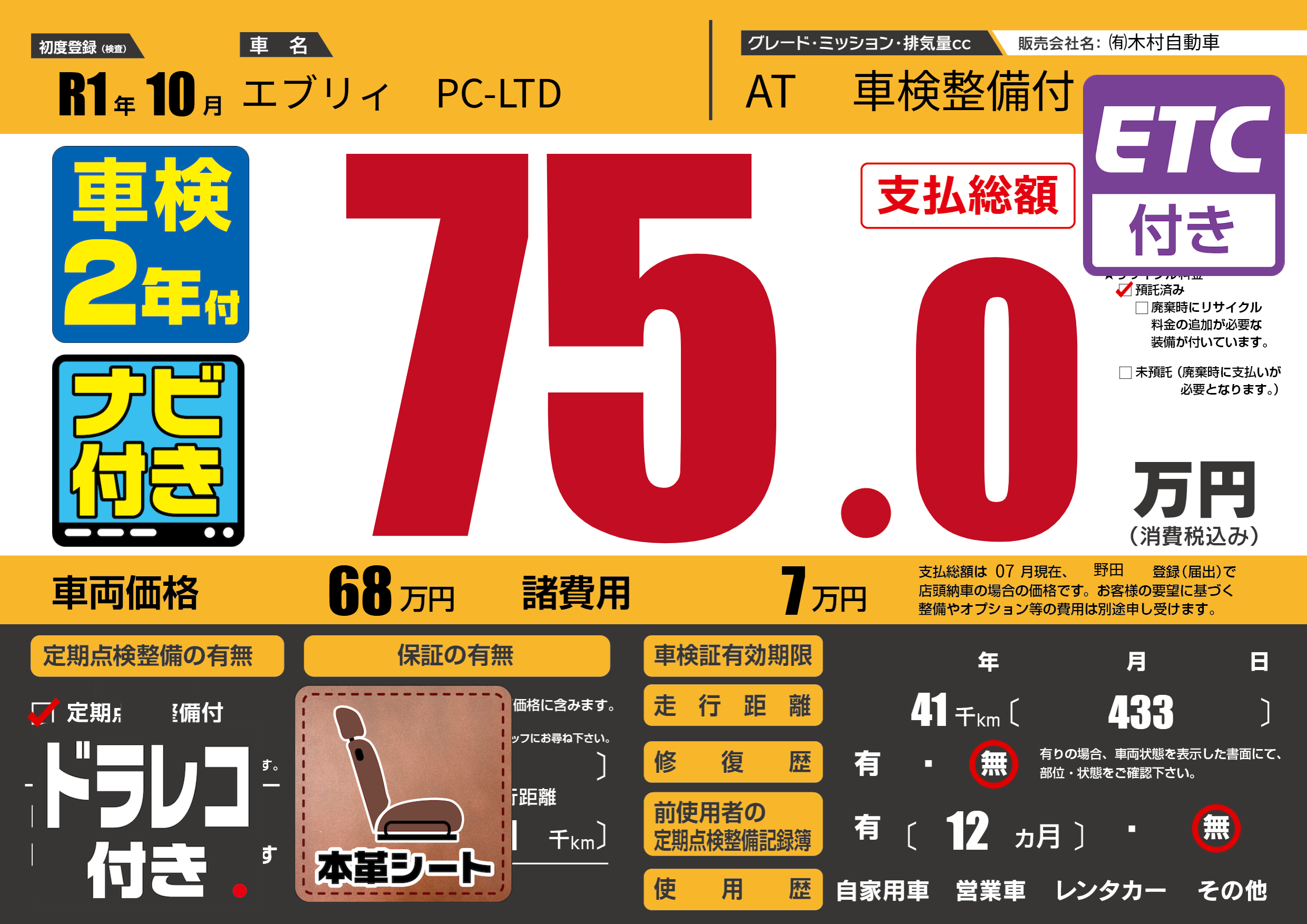 | 車名 | エブリィ PC-LTD | グレード ミッション 排気量 |