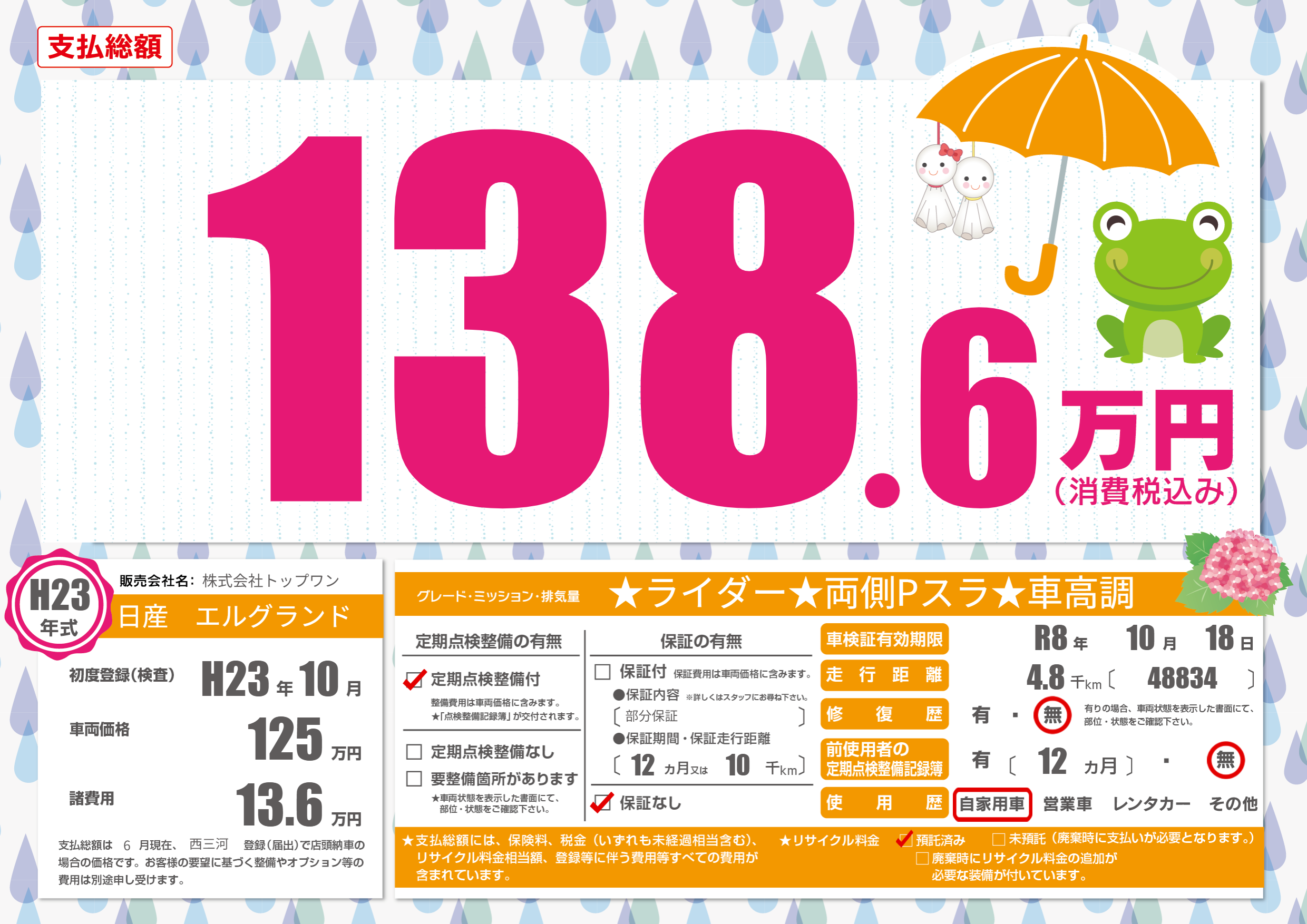 | 走行キロ | 0.4万km | 初年度登録 | H23年10月 |