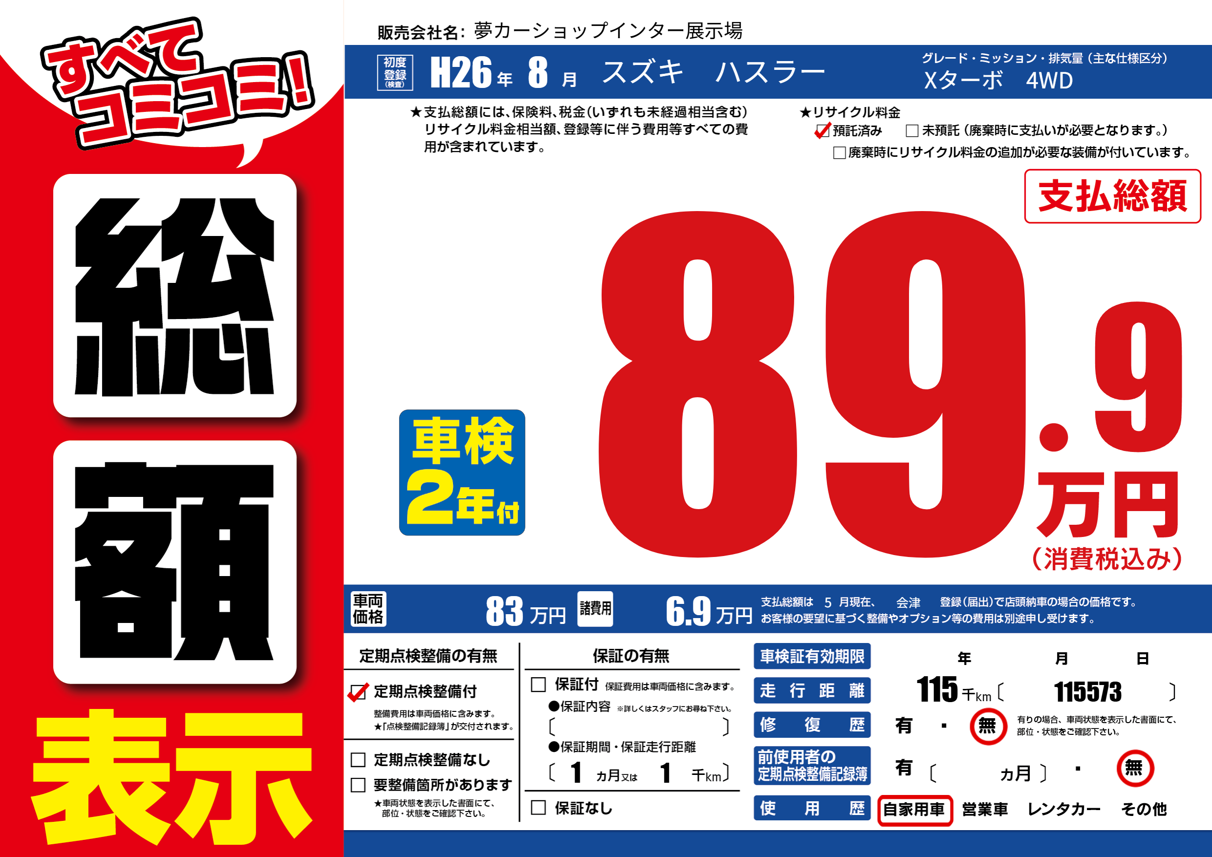 | 車名 | スズキ ハスラー | グレード ミッション 排気量 |