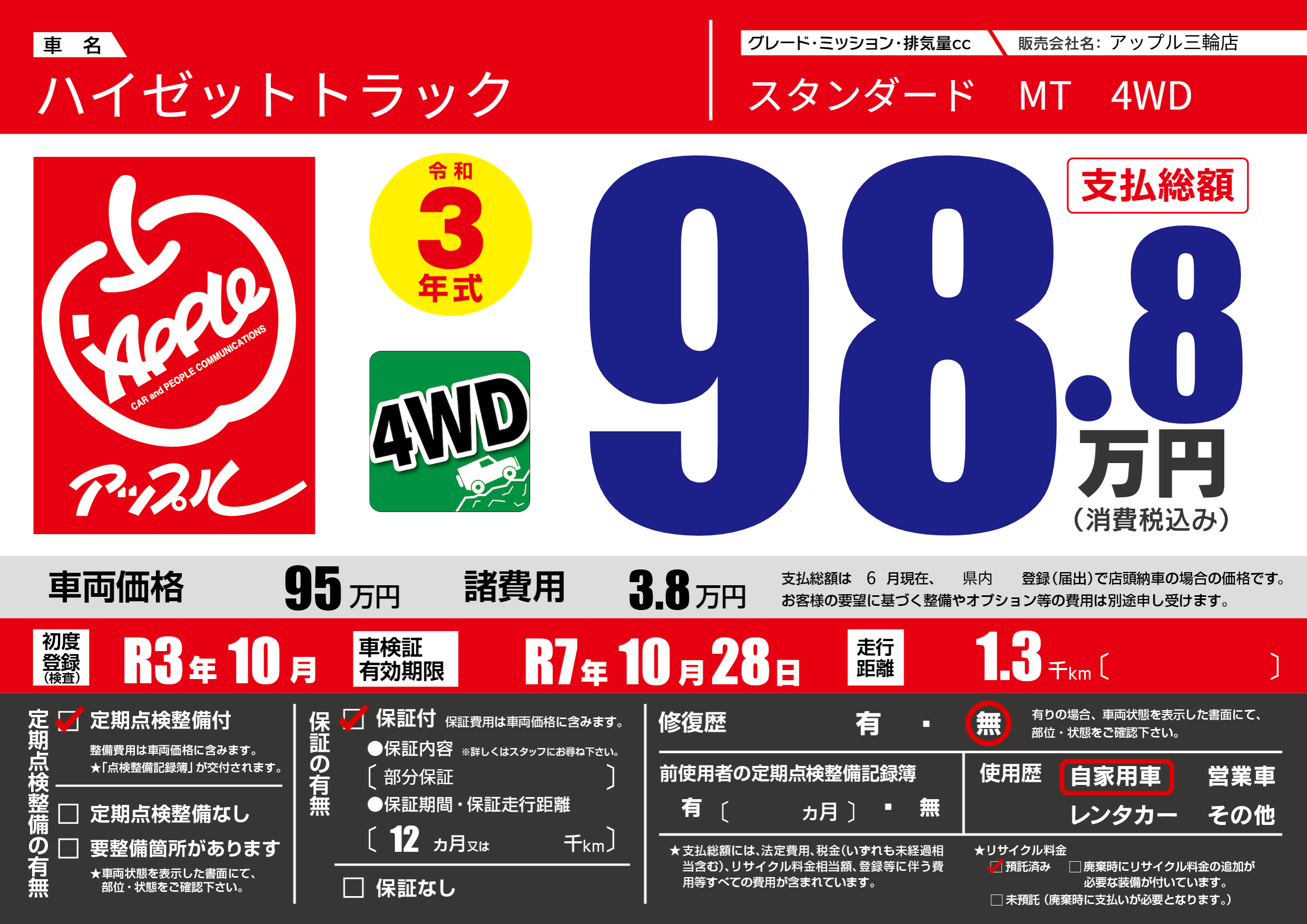 | 車名 | ハイゼットトラック | グレード ミッション 排気量 |