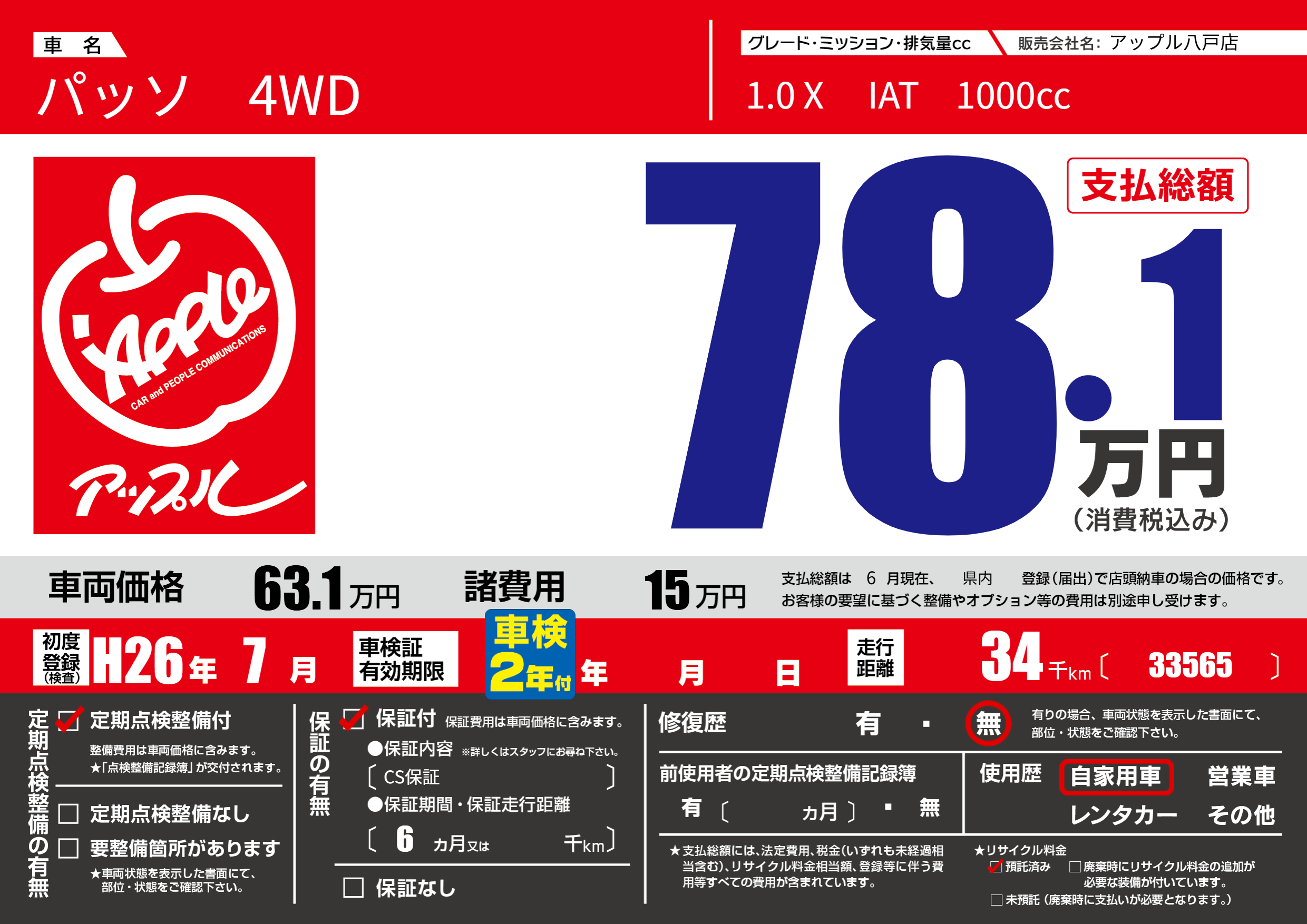 | 車名 | パッソ 4WD | グレード ミッション 排気量 |