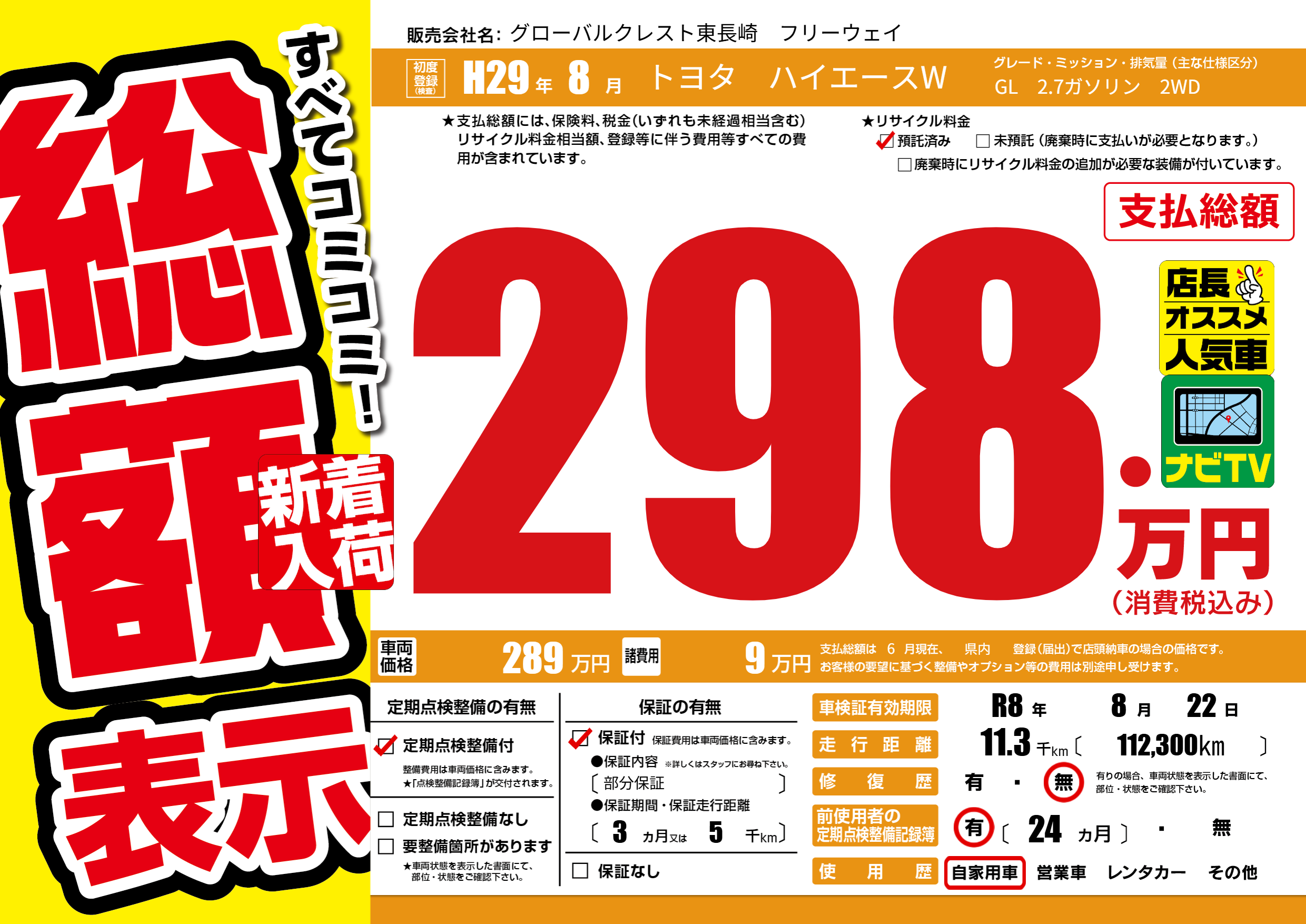 | 車名 | トヨタ ハイエースW | グレード ミッション 排気量 |