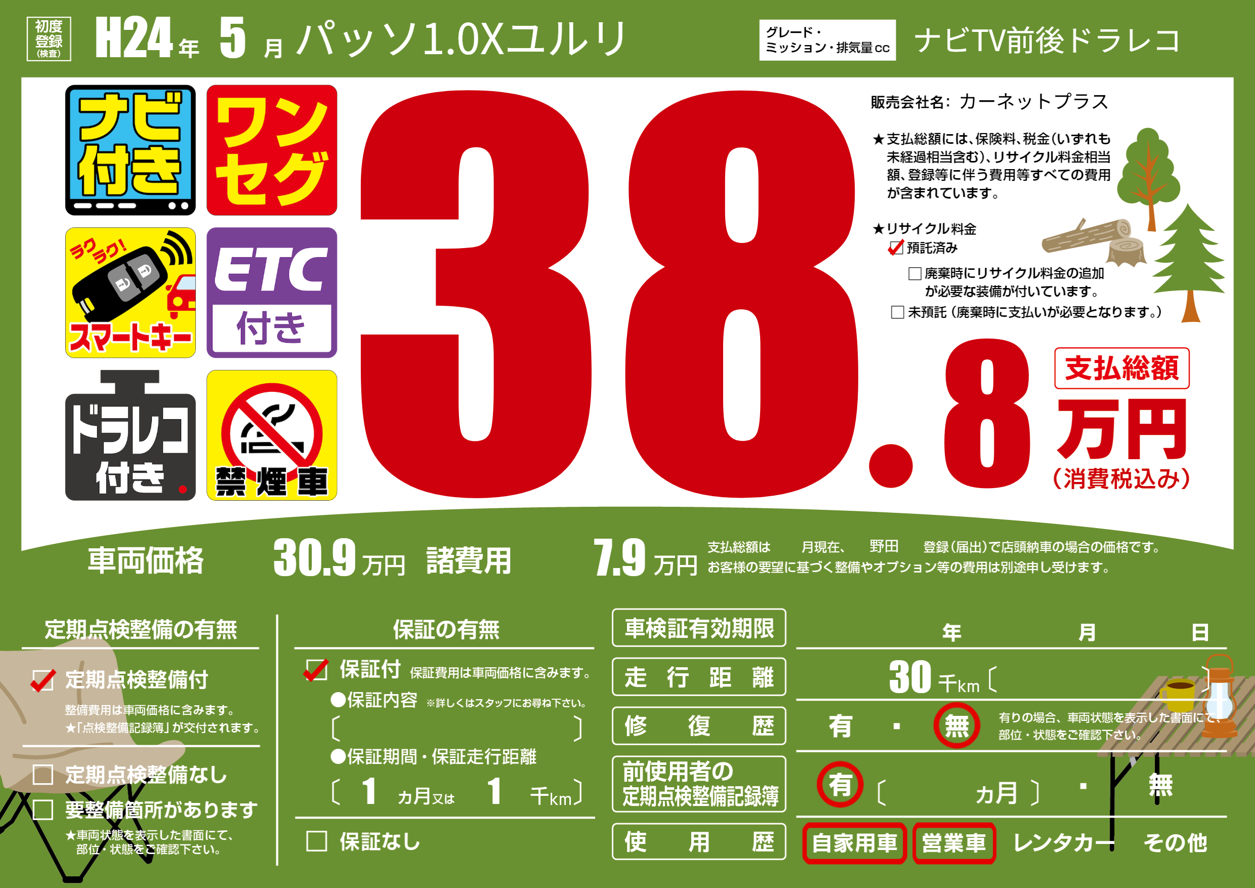| 車名 | パッソ1.0Xユルリ | グレード ミッション 排気量 |