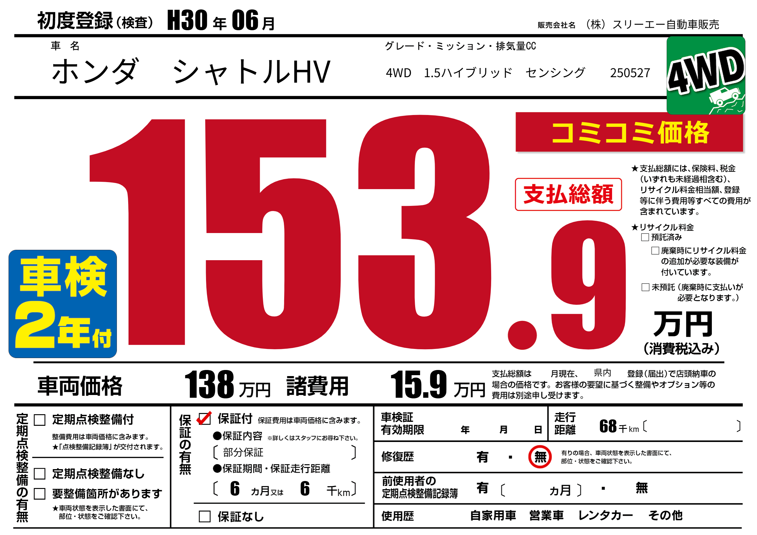 保証付き 保証内容(部分保証) 6ヶ月または(6)千kmまで |