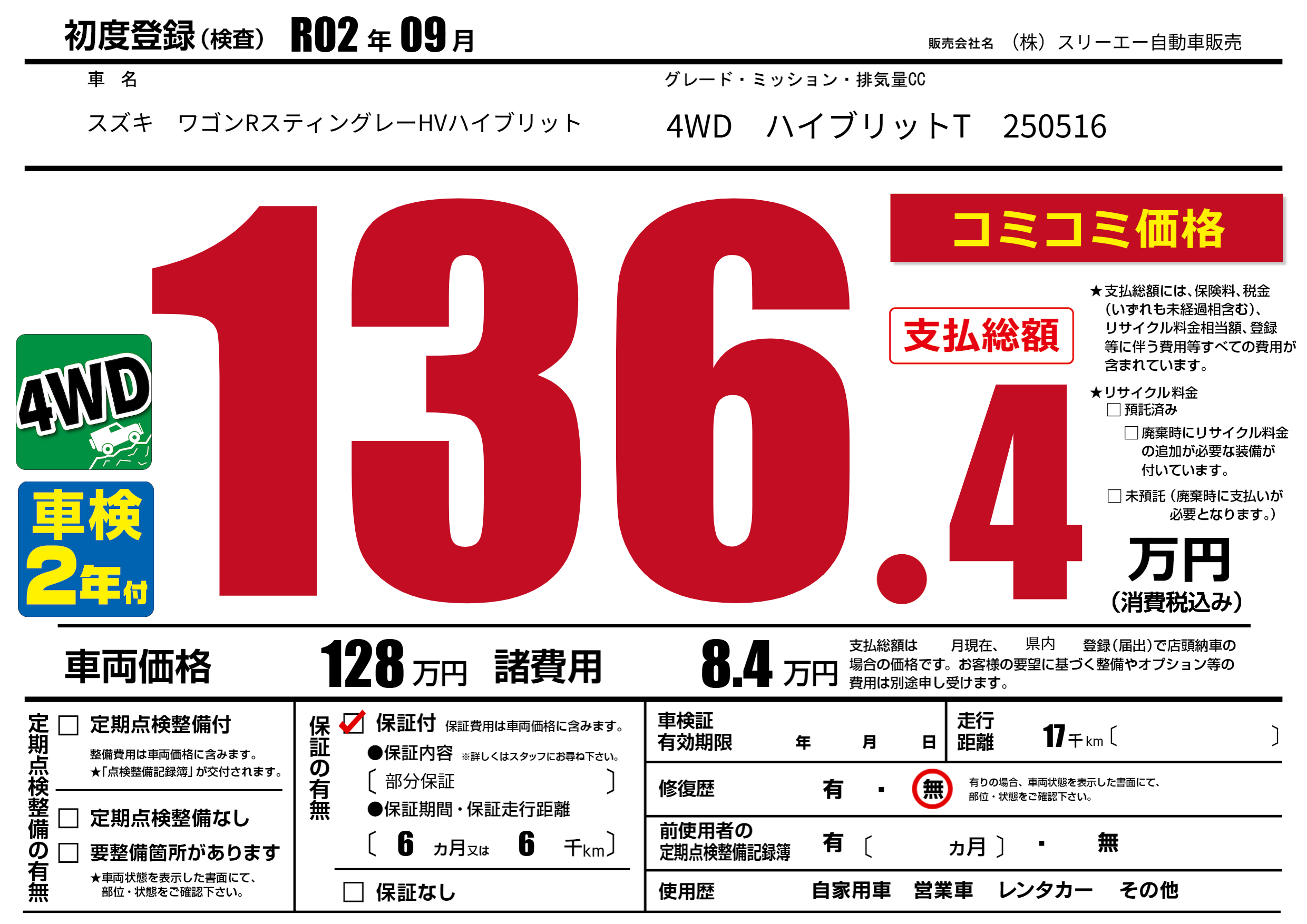 | 車名 | スズキ ワゴンRスティングレーHVハイブリット | グレード ミッション 排気量 |