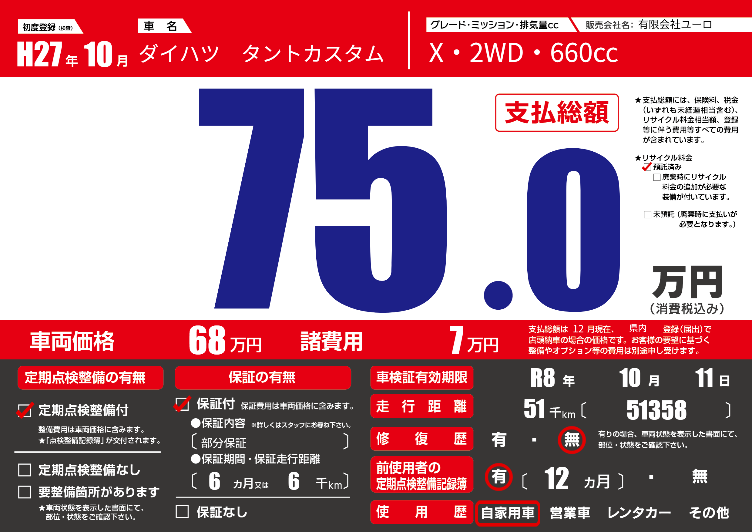 | 車名 | ダイハツ タントカスタム | グレード ミッション 排気量 |