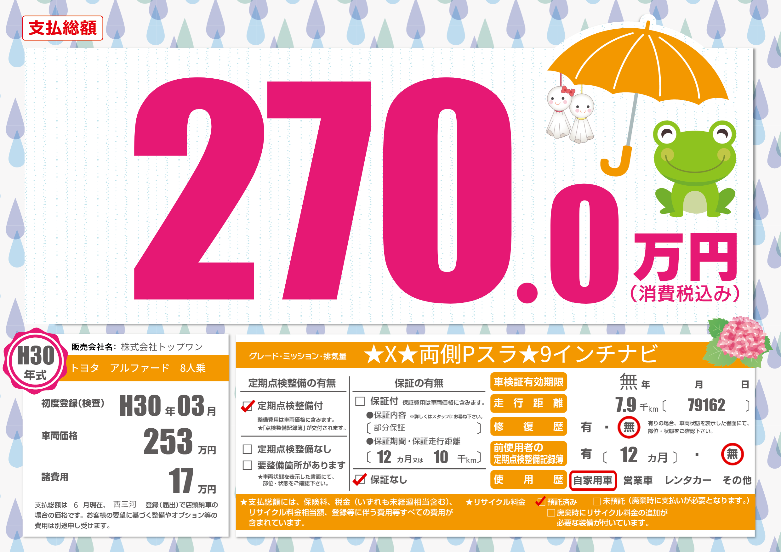 | 車名 | トヨタ アルファード 8人乗 | グレード ミッション 排気量 |