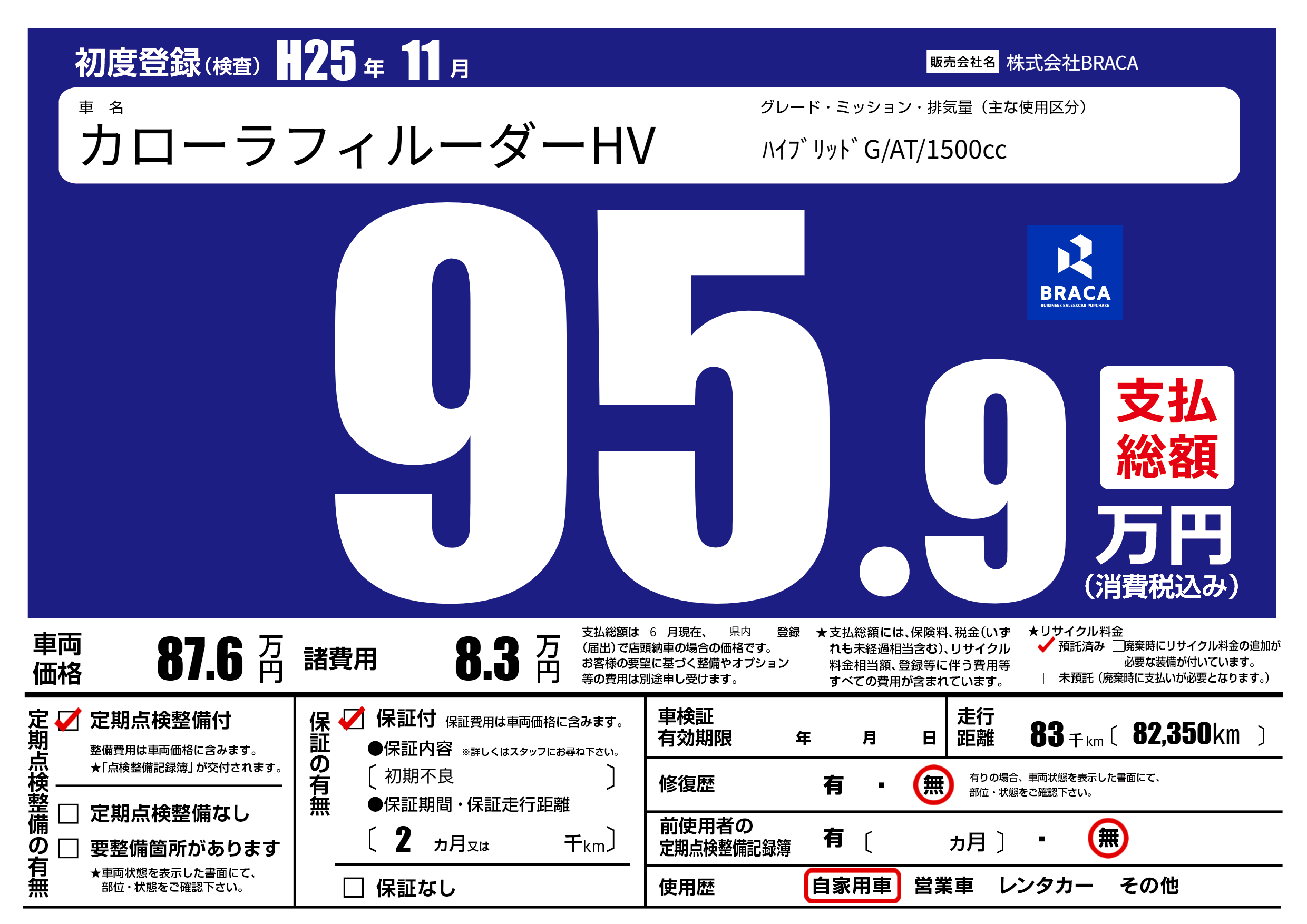 | 走行キロ | 8.3万km | 初年度登録 | H25年11月 |