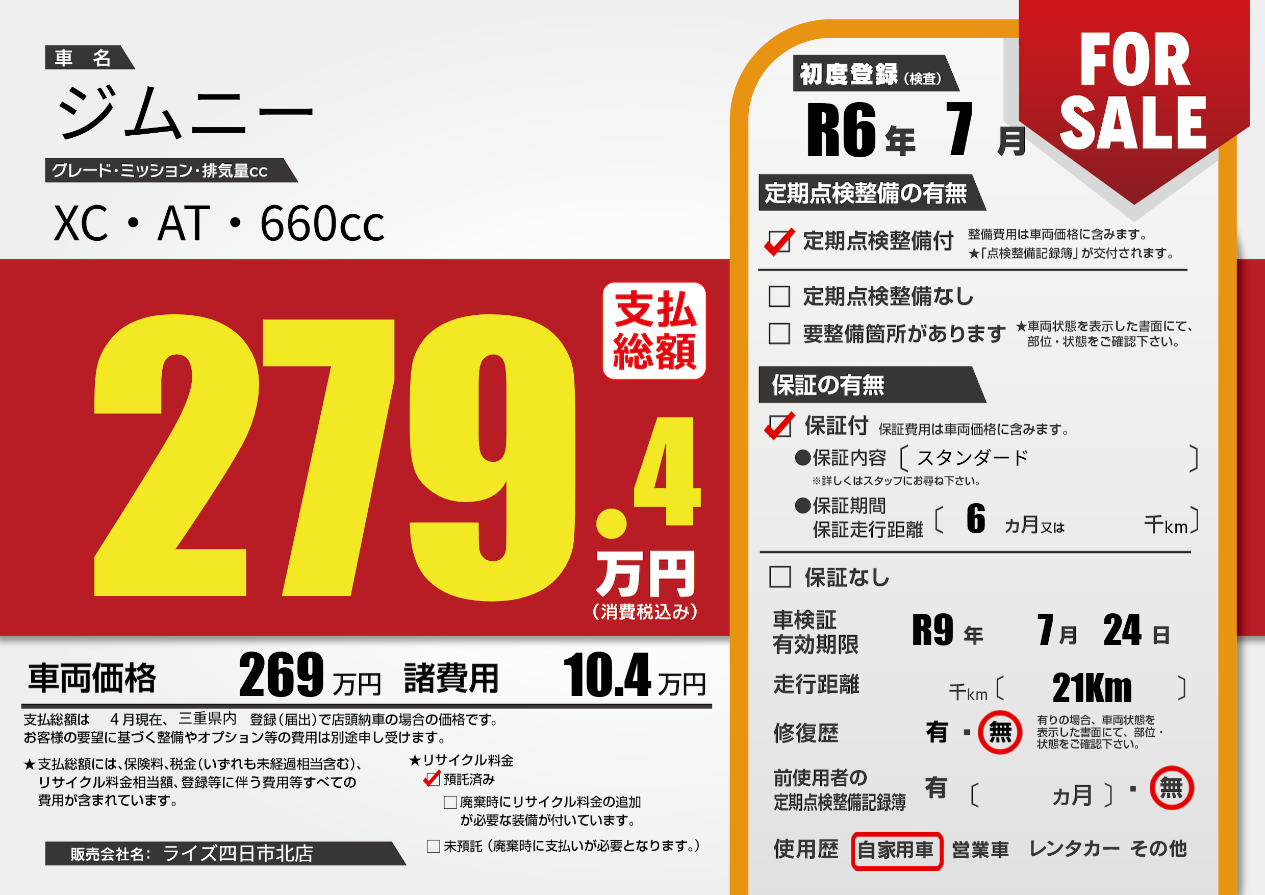 | 車名 | ジムニー | グレード ミッション 排気量 |