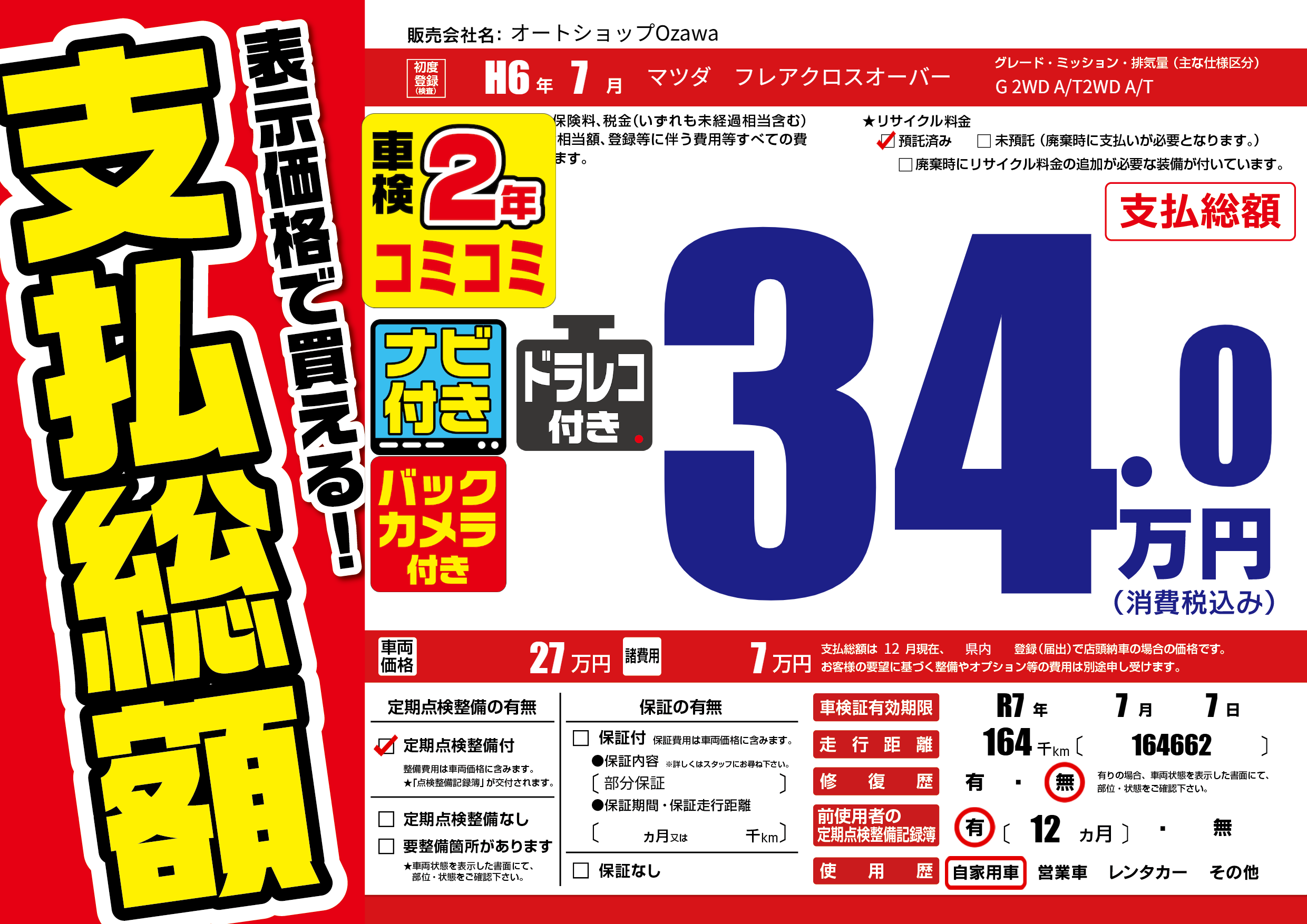 | 走行キロ | 16.4万km | 初年度登録 | H6年7月 |