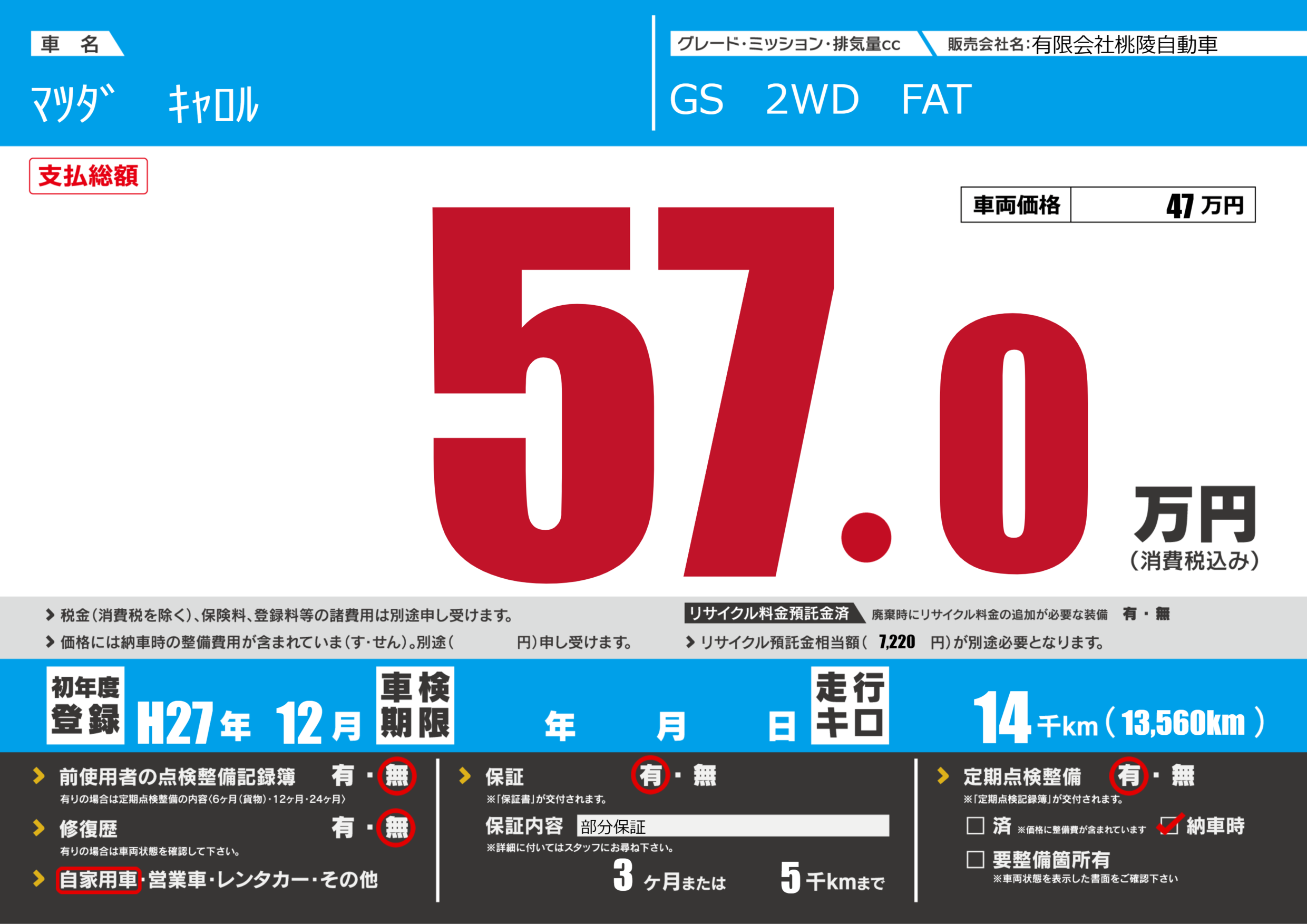 | 車名 | マツダ キャロル | グレード ミッション 排気量 |