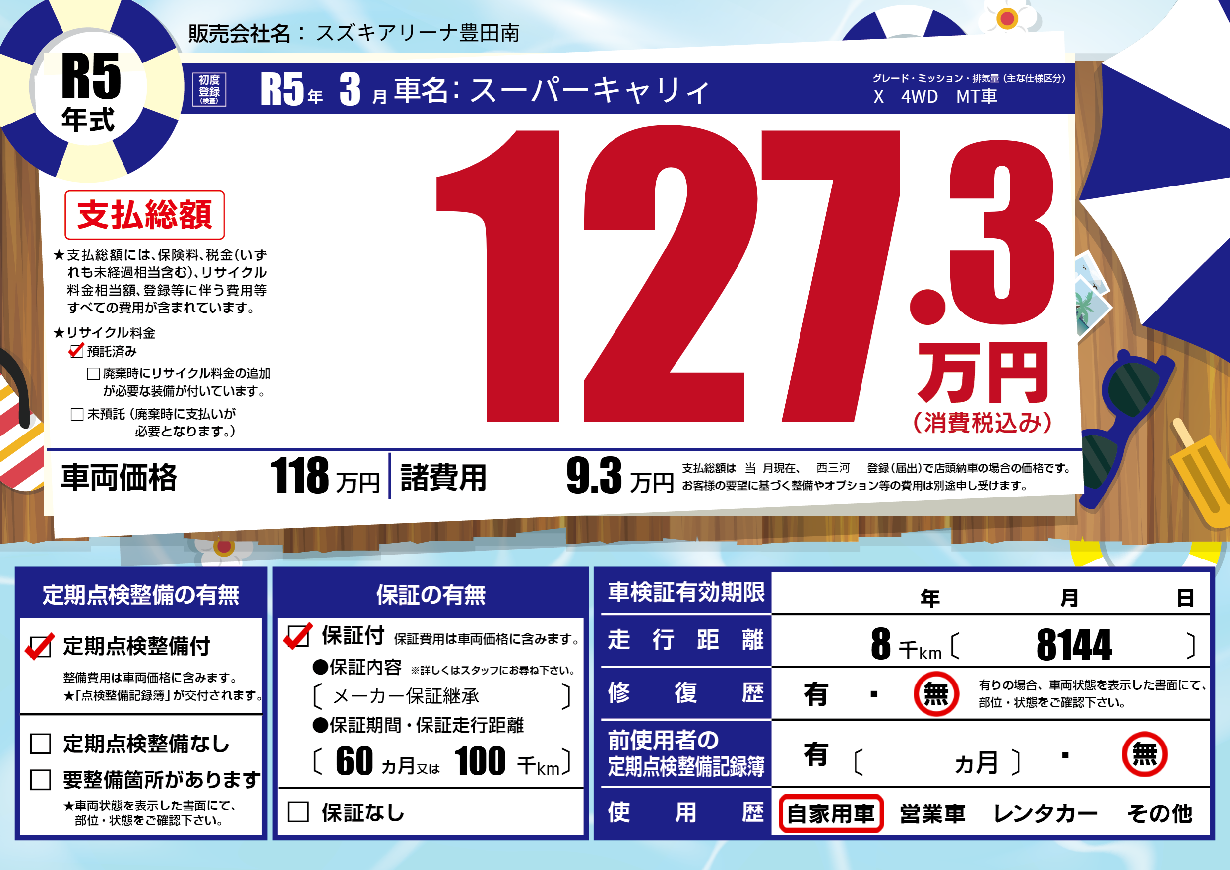 | 走行キロ | 0.8万km | 初年度登録 | R5年3月 |
