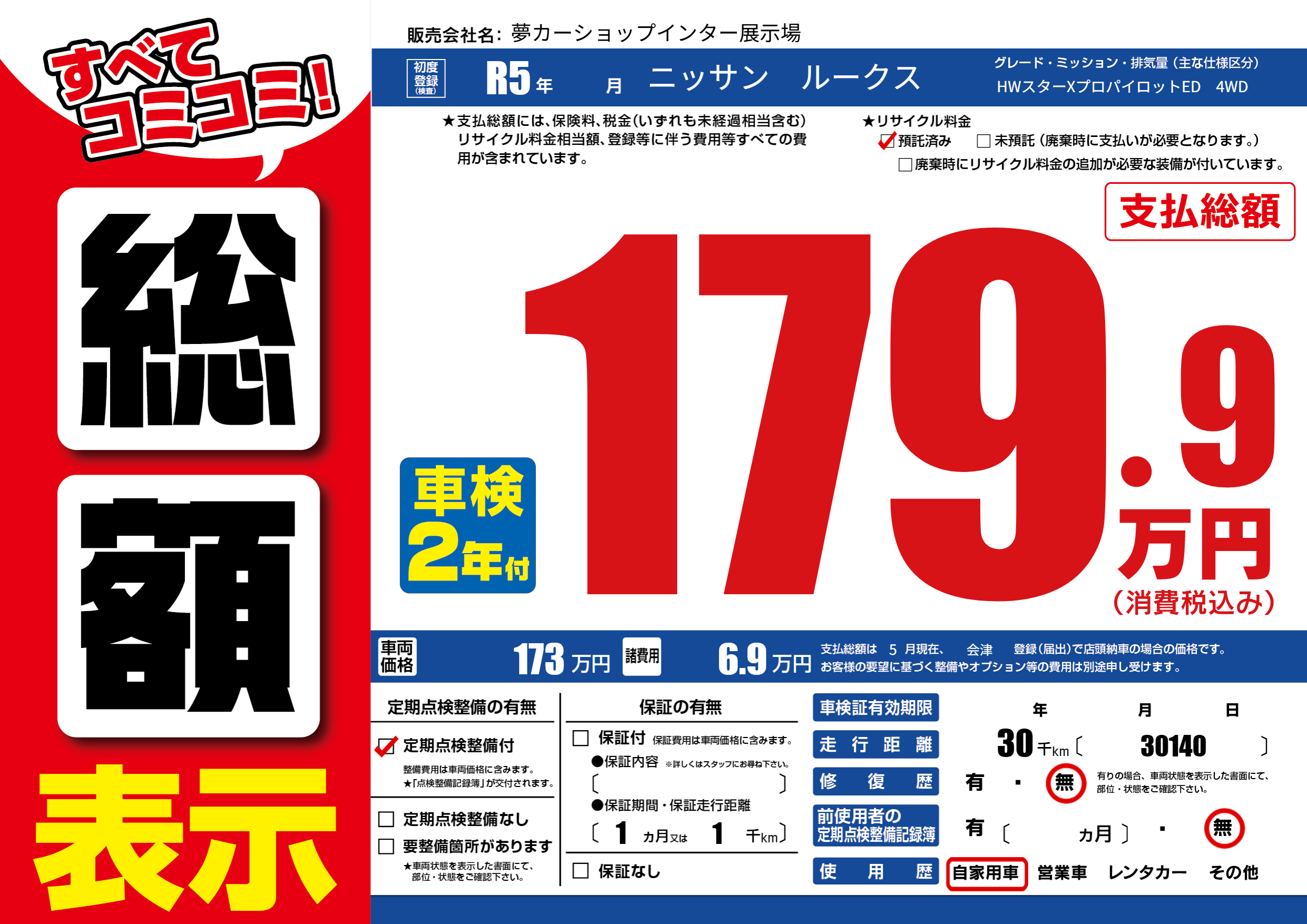| 走行キロ | 3万km | 初年度登録 | R5年---月 |