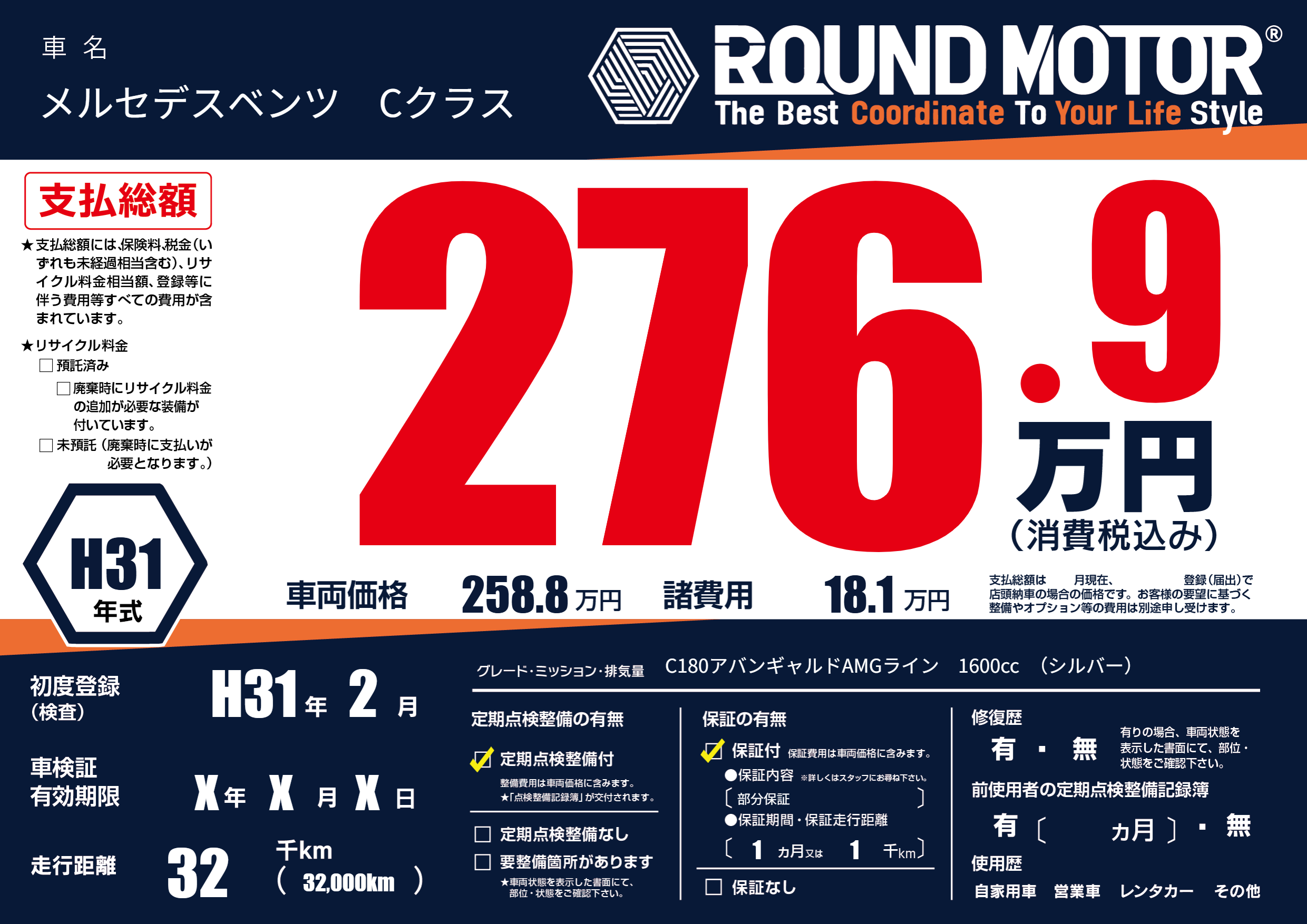 | 車名 | メルセデスベンツ Cクラス | グレード ミッション 排気量 |