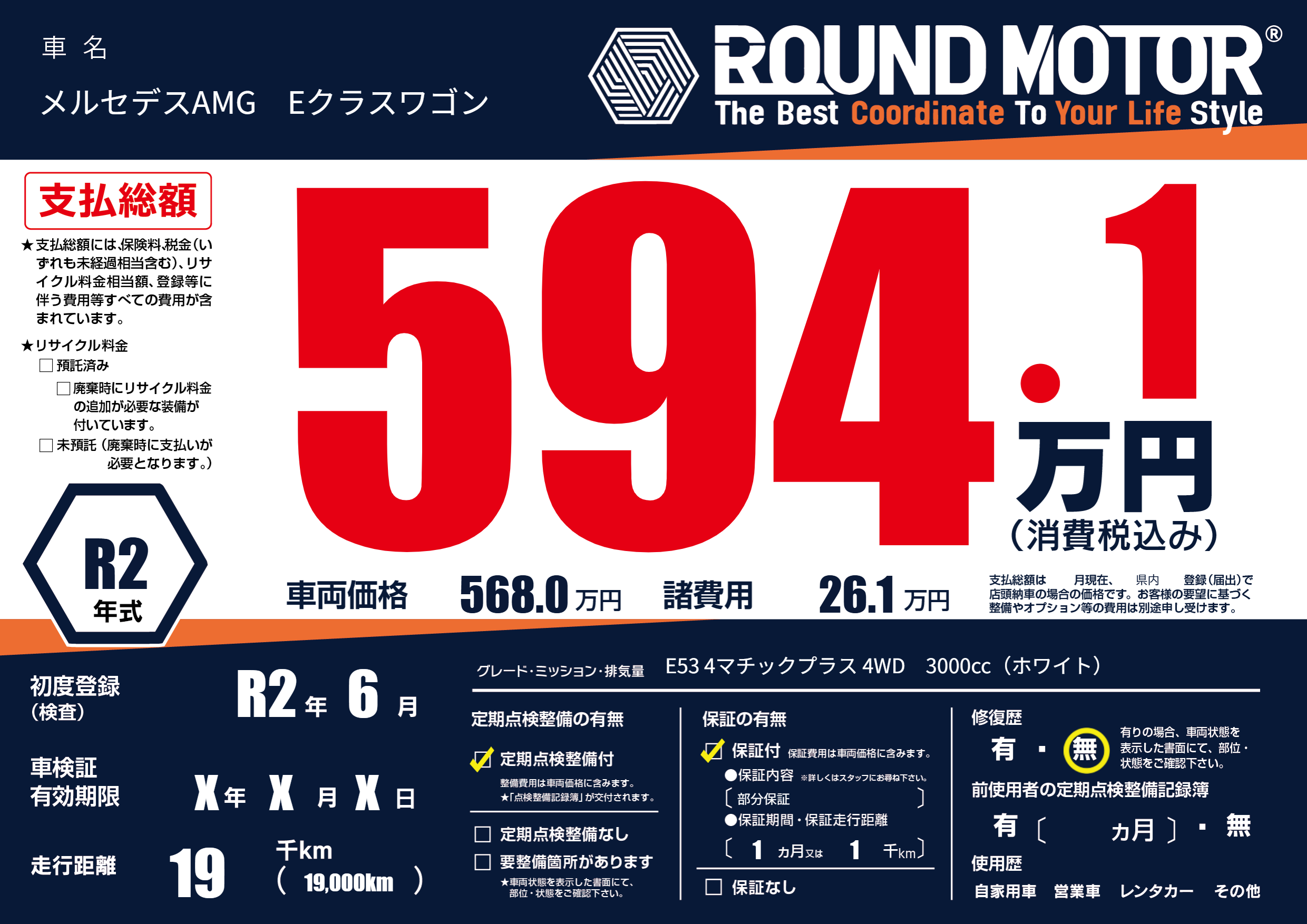 | 車名 | メルセデスAMG Eクラスワゴン | グレード ミッション 排気量 |