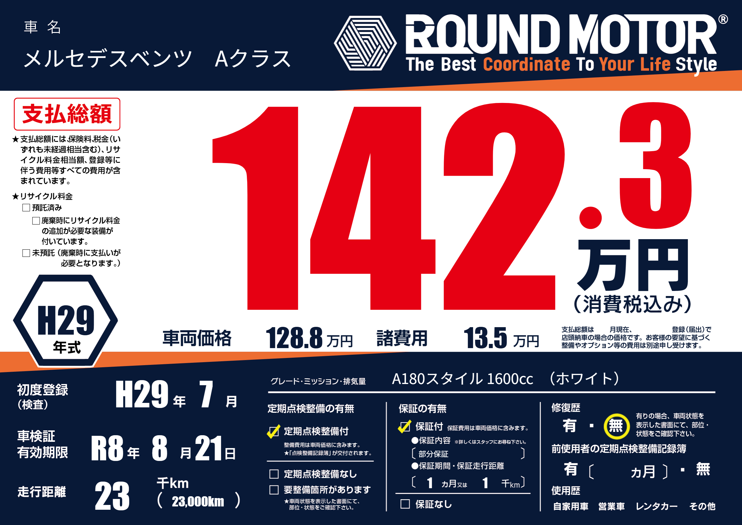 | 車名 | メルセデスベンツ Aクラス | グレード ミッション 排気量 |