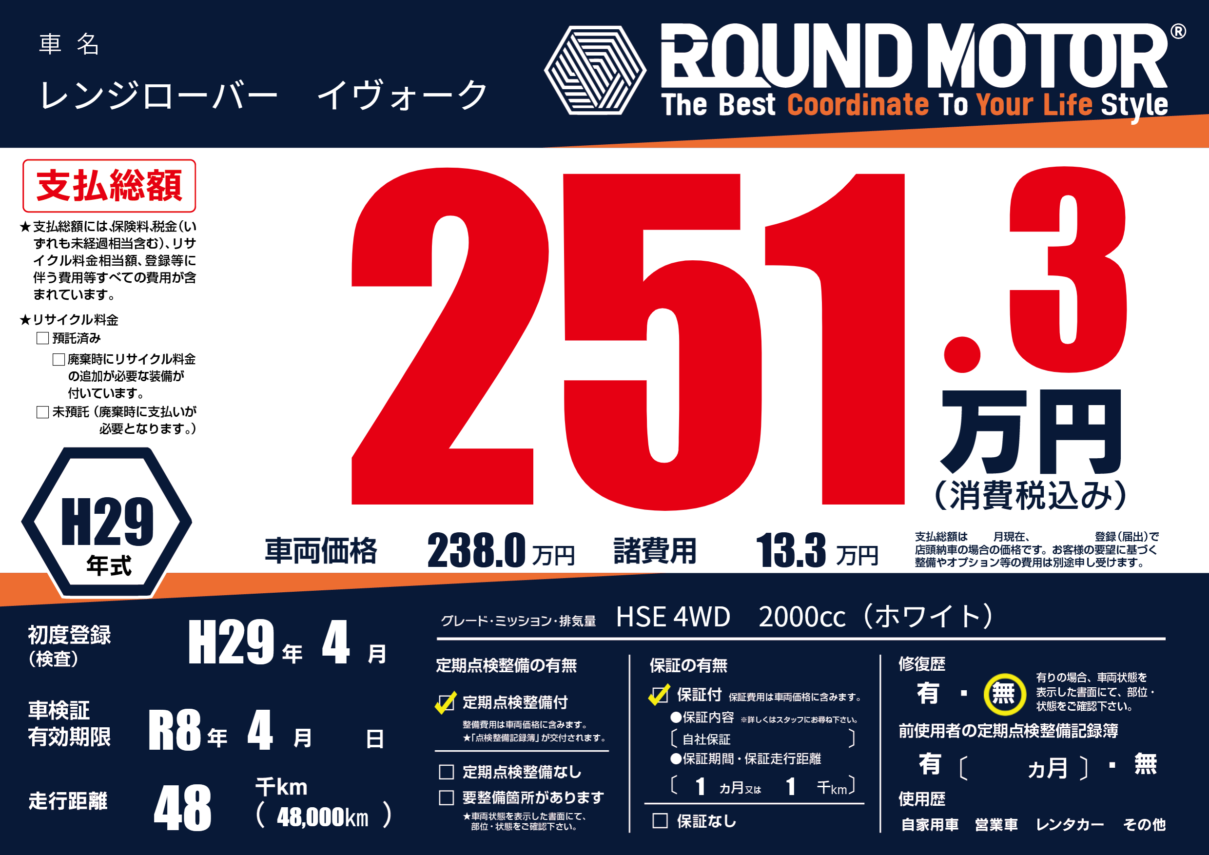 | 車名 | レンジローバー イヴォーク | グレード ミッション 排気量 |
