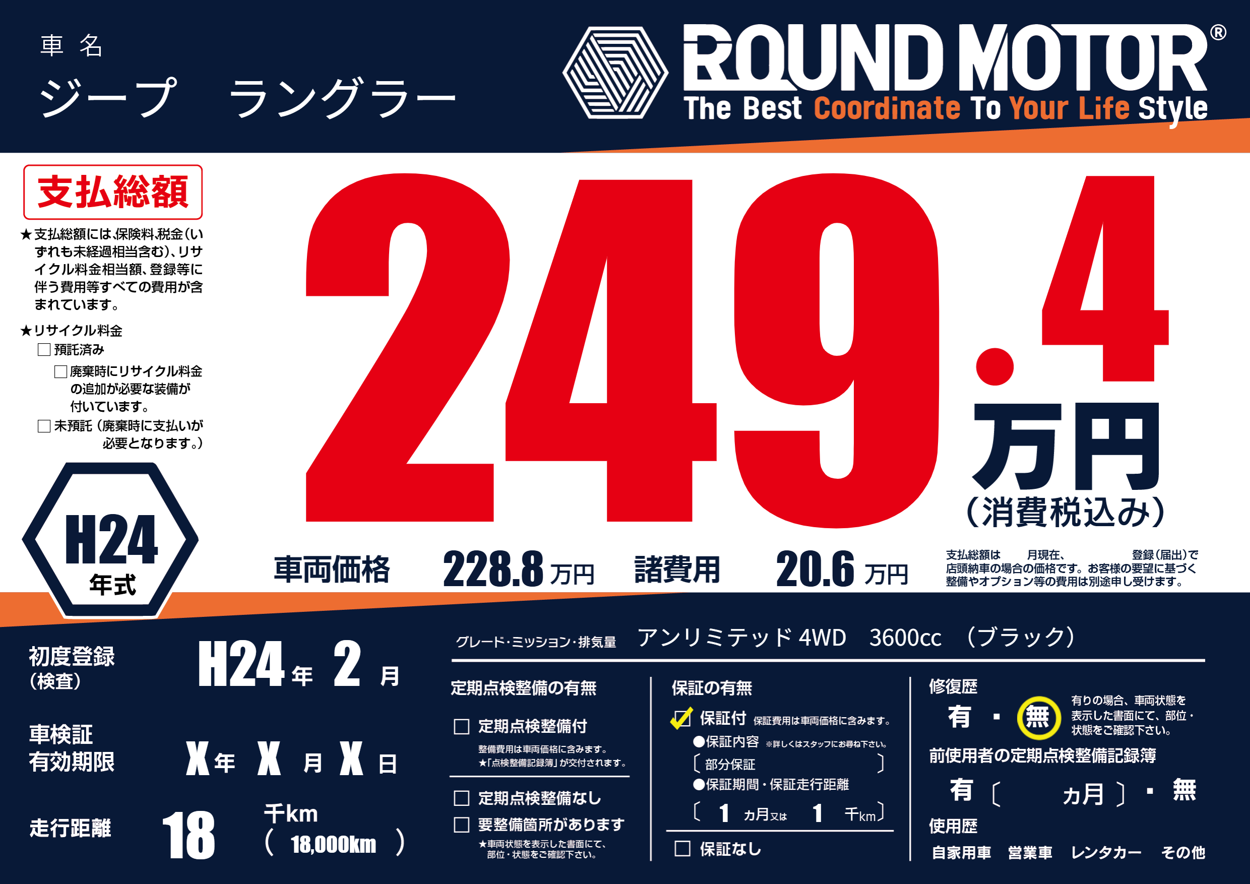 | 車名 | ジープ ラングラー | グレード ミッション 排気量 |