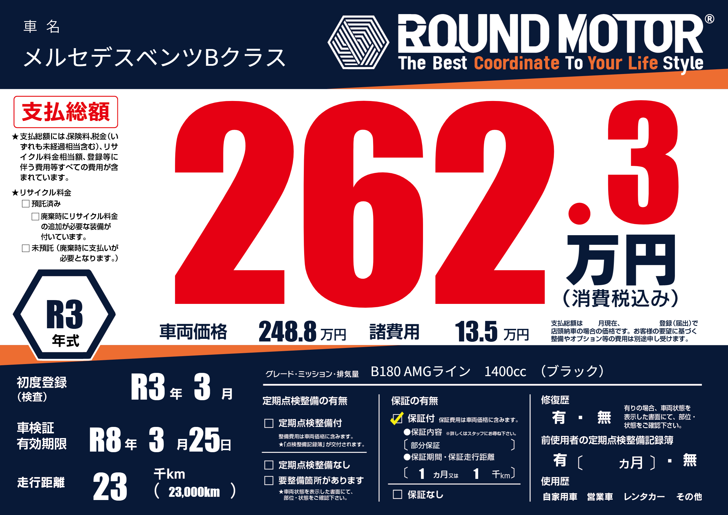 | 車名 | メルセデスベンツBクラス | グレード ミッション 排気量 |