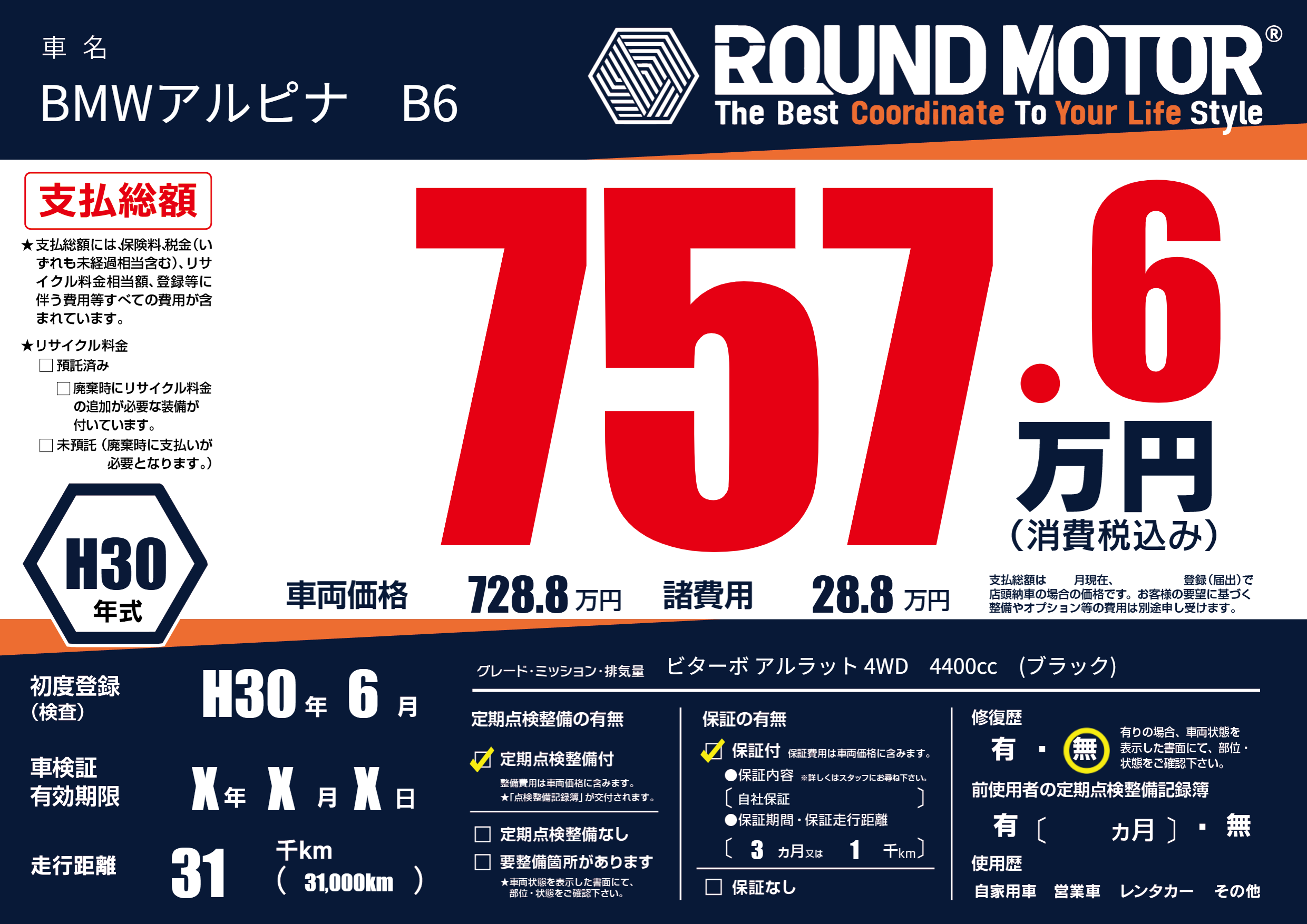 | 車名 | BMWアルピナ B6 | グレード ミッション 排気量 |