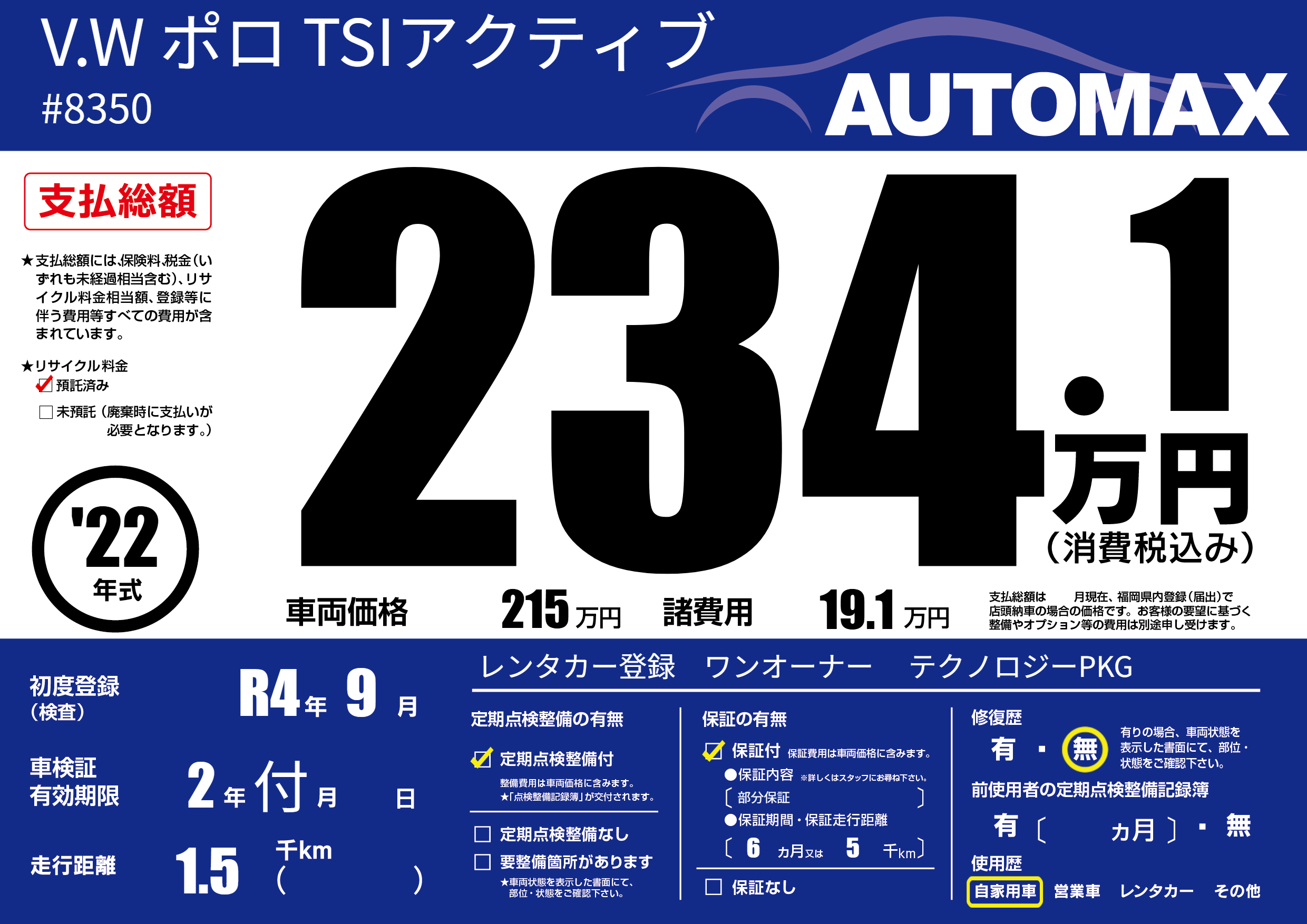 | 車名 | V.W ポロ TSIアクティブ | グレード ミッション 排気量 |