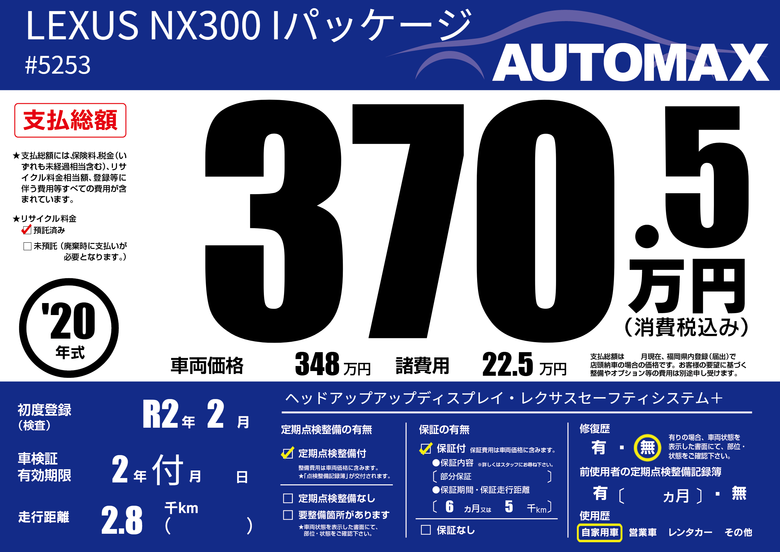 | 車名 | LEXUS NX300 Iパッケージ | グレード ミッション 排気量 |