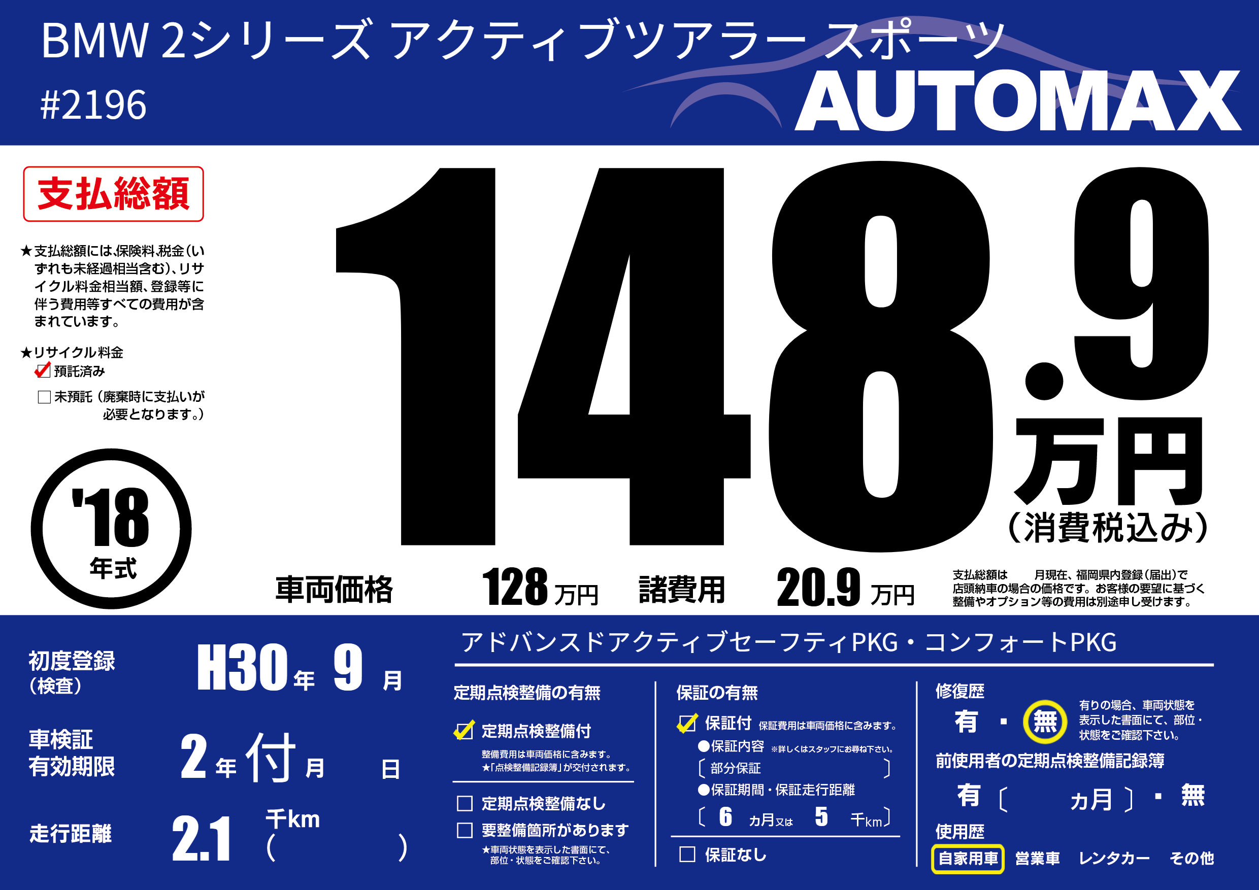 | 走行キロ | 0.2万km | 初年度登録 | H30年9月 |