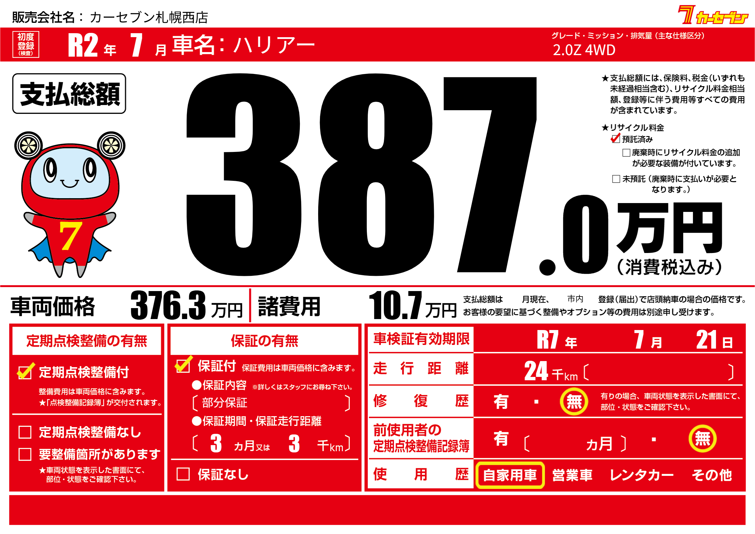 | 走行キロ | 2.4万km | 初年度登録 | R2年7月 |