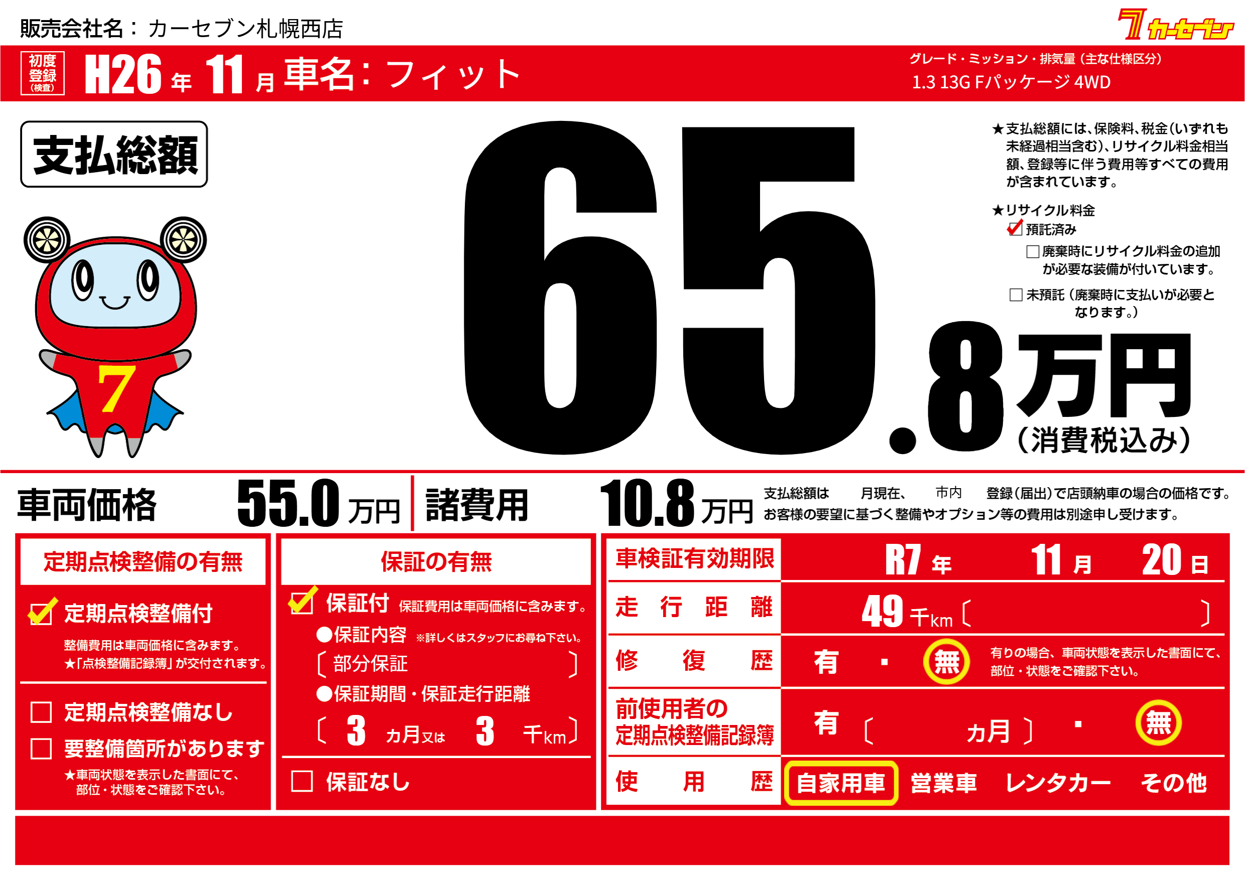 | 走行キロ | 4.9万km | 初年度登録 | H26年11月 |