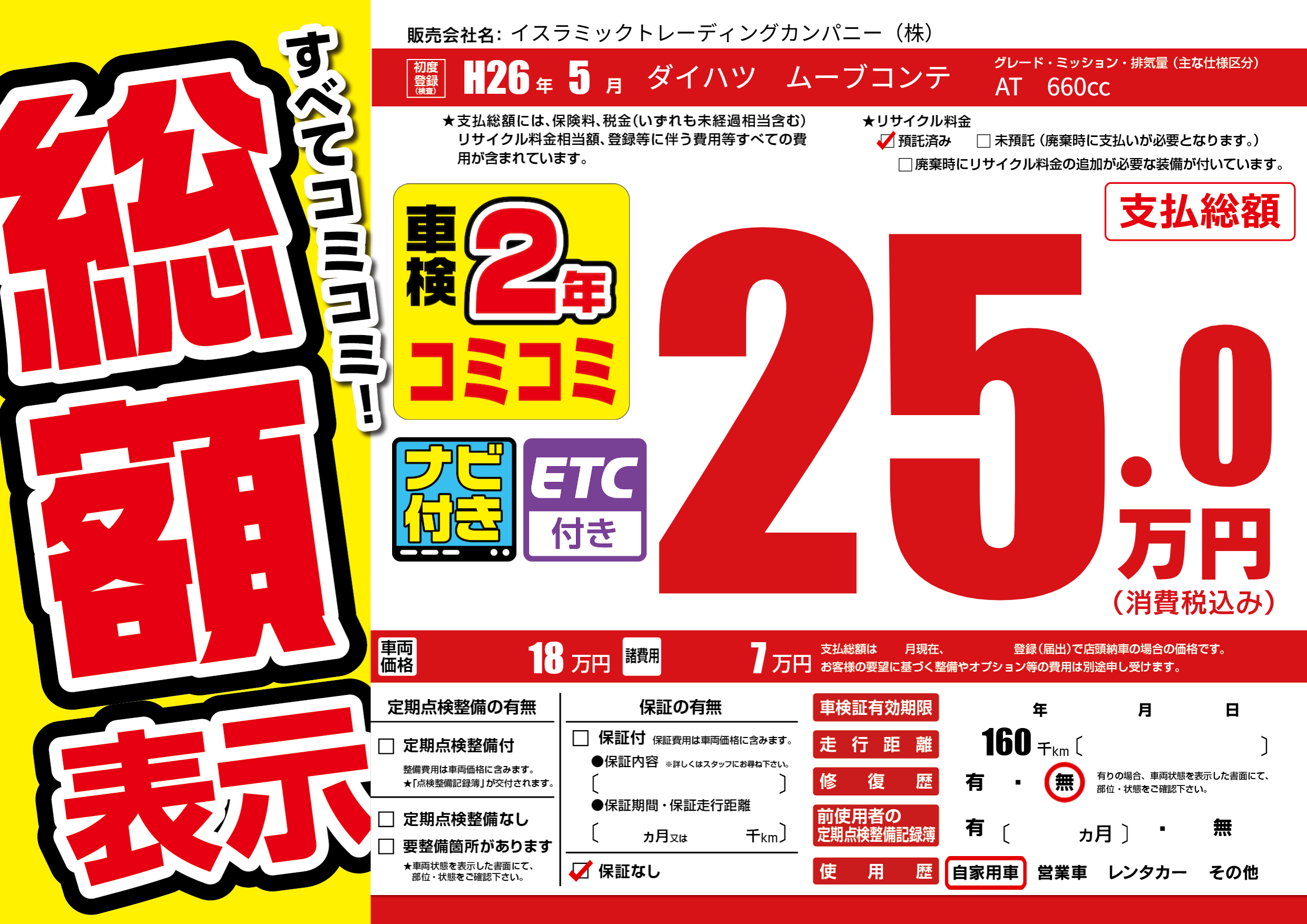 | 車名 | ダイハツ ムーブコンテ | グレード ミッション 排気量 |